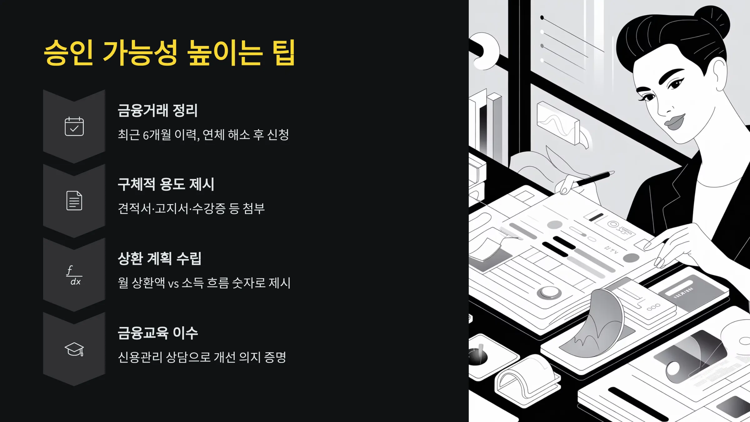 첫째, 최근 6개월 금융거래 이력을 정리하시고, 연체·미납이 있다면 정리 후 신청하시길 권합니다.