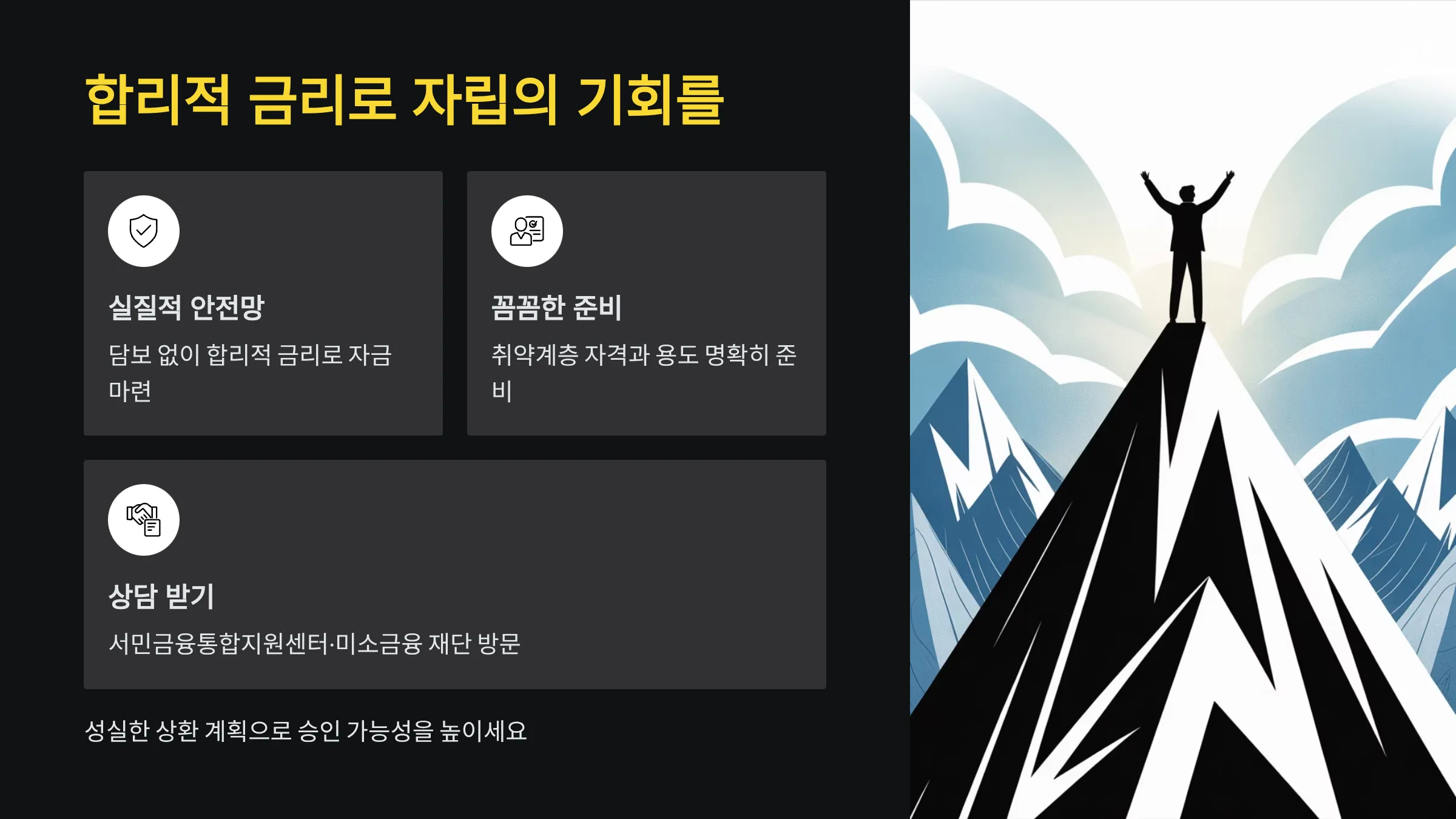 미소금융 취약계층 자립자금 지원은 담보 없이도 합리적인 금리로 꼭 필요한 자금을 마련할 수 있도록 돕는 실질적 안전망입니다. 본인의 취약계층 자격과 자금 용도를 명확히 준비하시고, 가까운 서민금융통합지원센터 또는 지역 미소금융 재단에서 상담을 받아 보시기 바랍니다. 꼼꼼한 서류 준비와 성실한 상환 계획만 갖추시면 승인 가능성을 충분히 높이실 수 있습니다.