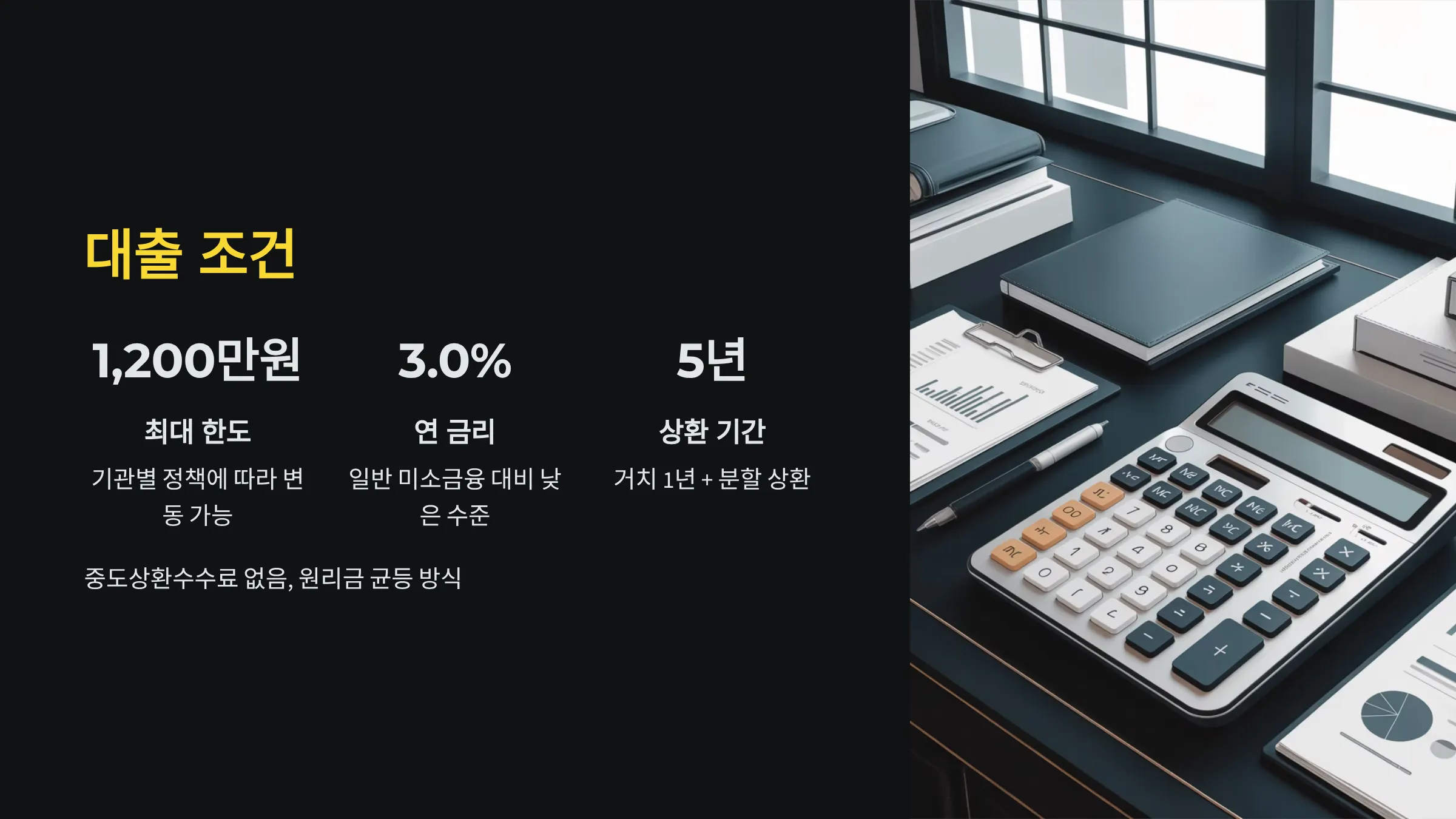 한도는 보통 최대 1,200만원 수준이며(기관별 정책에 따라 일부 변동 가능), 금리는 연 3.0% 내외로 설계되는 경우가 일반적입니다. 상환 구조는 1년 이내 거치 후 최대 5년 분할 상환 방식(원리금 균등)이 표준이며, 중도상환수수료 없이 조기상환이 가능한 곳이 많습니다.