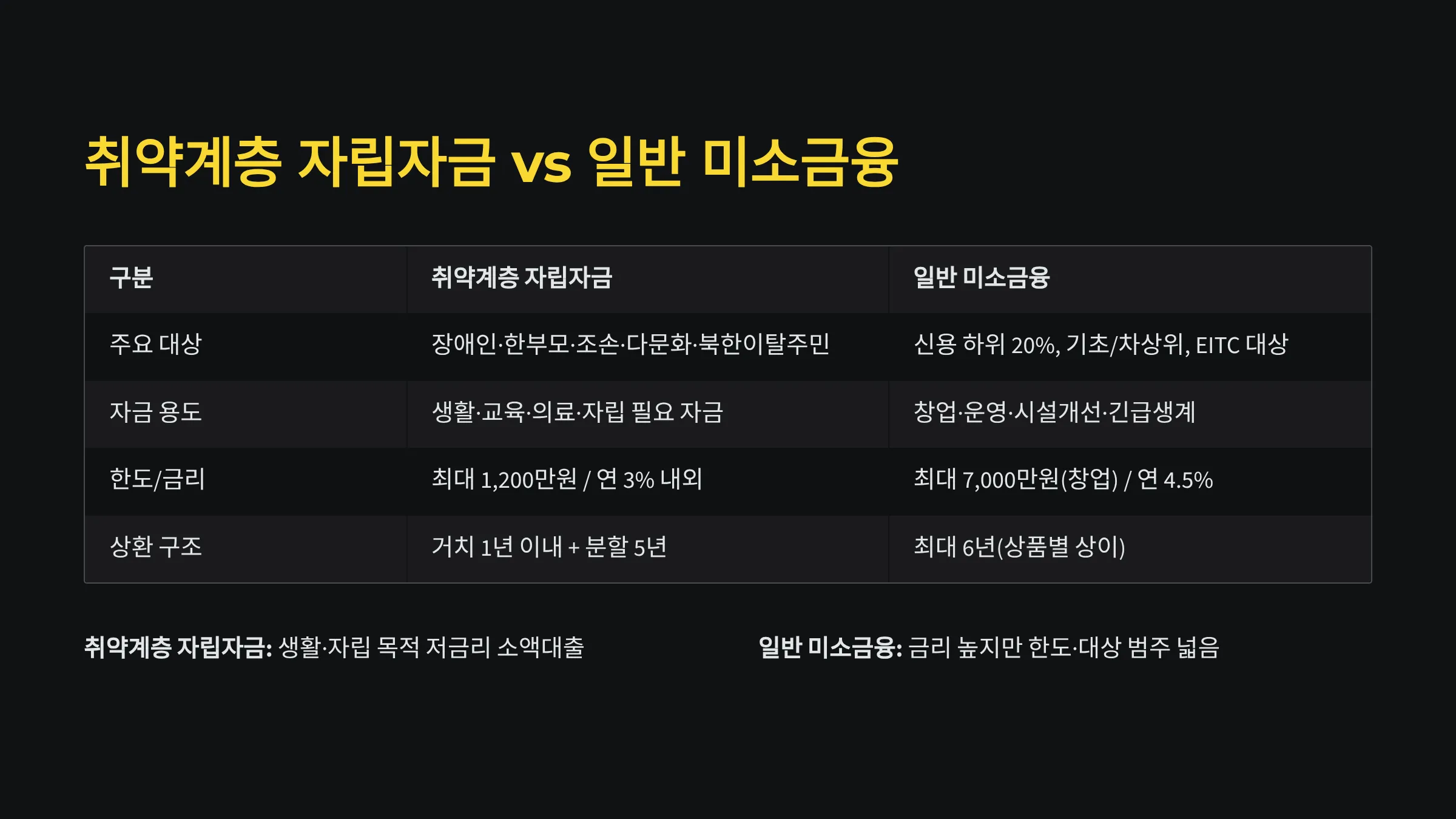 | 항목 | 취약계층 자립자금 | 일반 미소금융 |