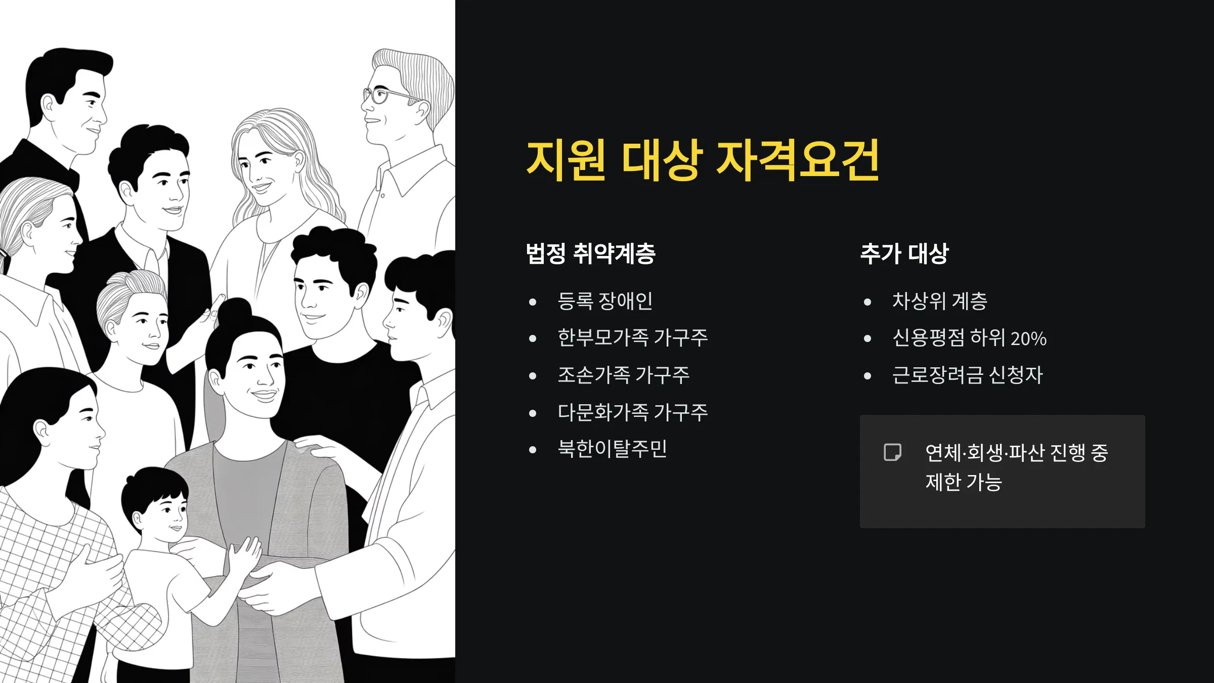 | 주요 대상 | 장애인·한부모·조손·다문화·북한이탈주민 등 | 신용 하위 20%, 기초/차상위, EITC 대상 등 |