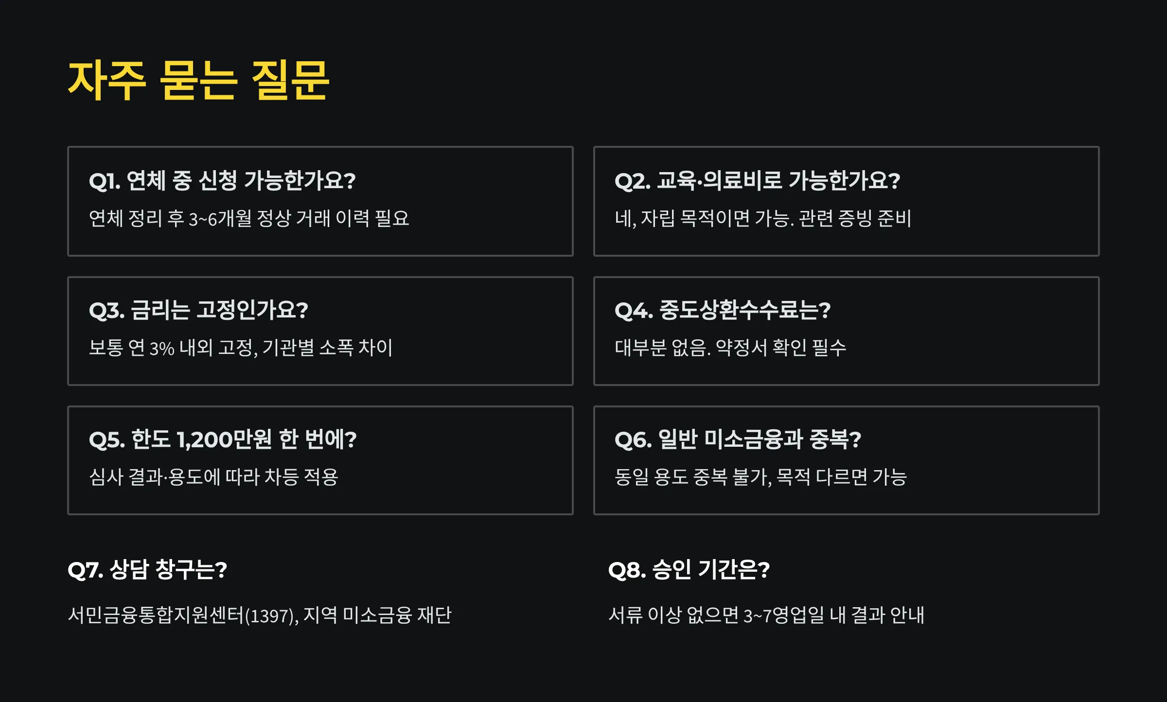 또한 지역 재단에 따라 차상위 계층, 신용평점 하위 20% 이하, 근로장려금(EITC) 신청 대상자 등 저소득·저신용 범주에 해당하는 분들도 심사 후 지원 대상에 포함될 수 있습니다. 단, 연체 중이거나 회생·파산 진행 중인 경우에는 제한을 받을 수 있습니다.