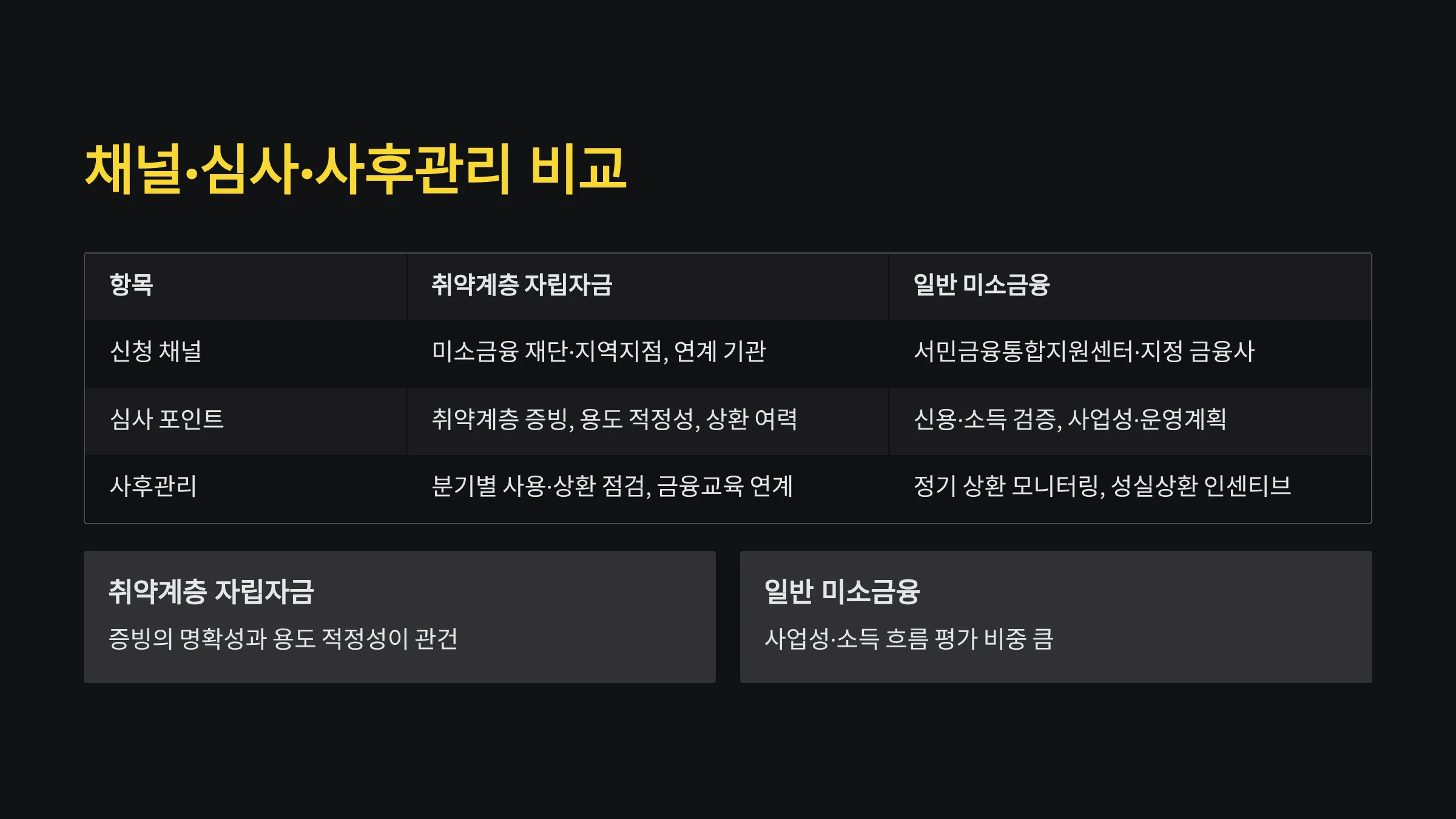 | 심사 포인트 | 취약계층 증빙, 용도 적정성, 상환 여력 | 신용·소득 검증, 사업성·운영계획 |