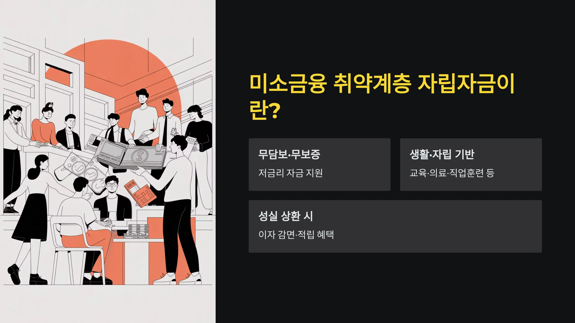 미소금융 취약계층 자립자금 지원은 생활·자립 목적의 저금리 소액대출에 초점이 맞춰져 있습니다.