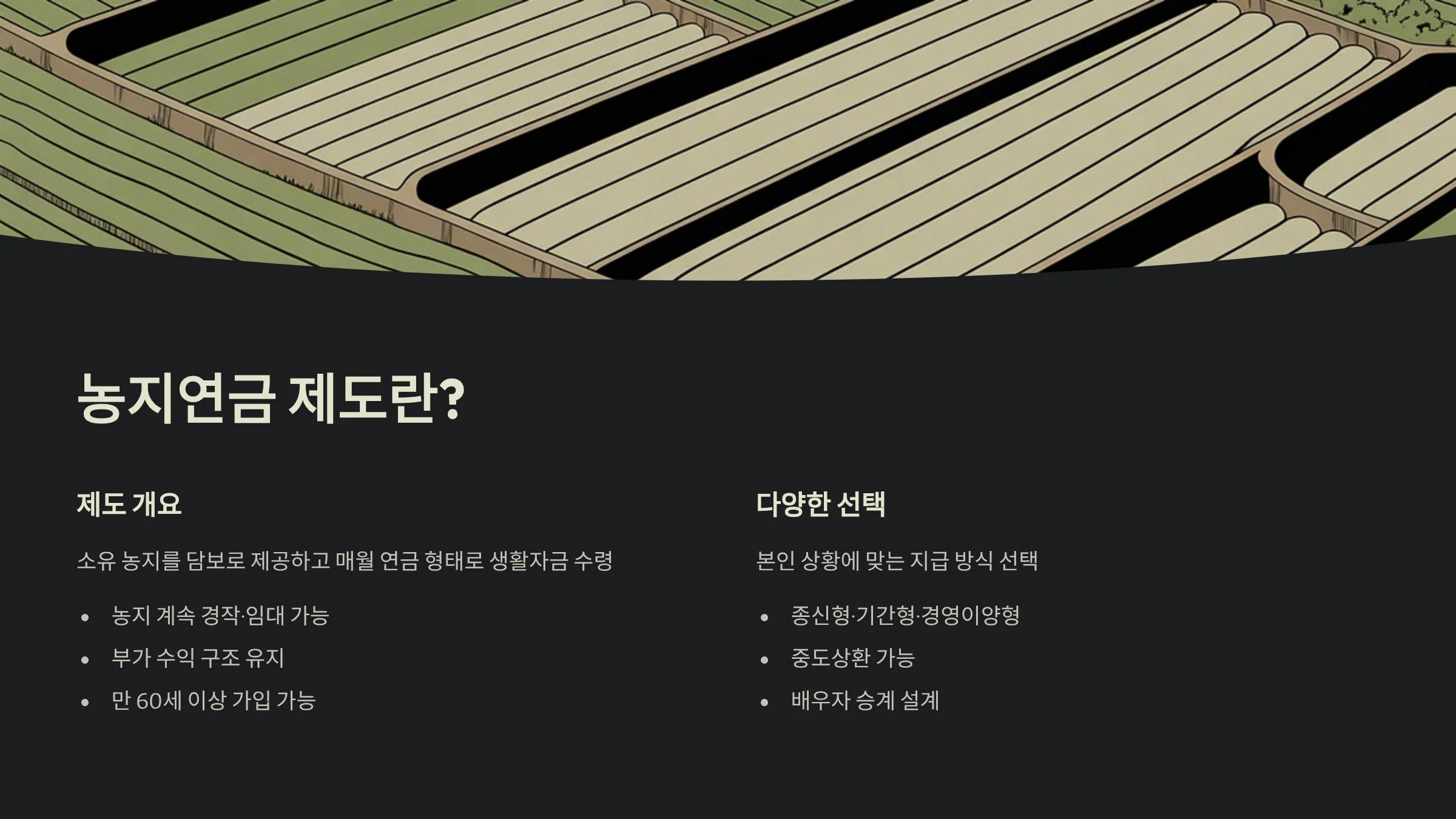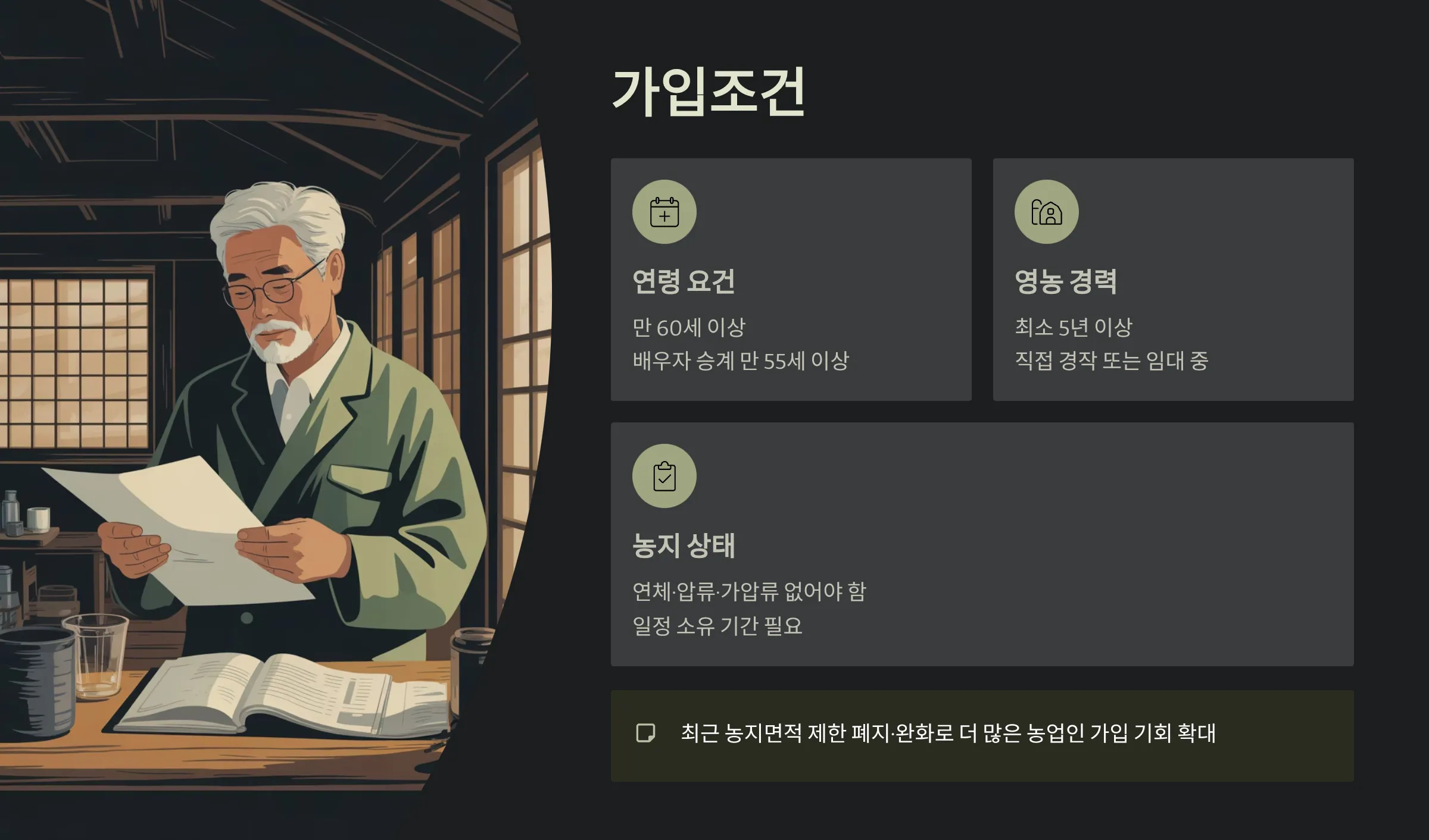 이 제도는 만 60세 이상(과거에는 만 65세)부터 가입이 가능하도록 연령 기준이 낮아졌으며, 5년 이상 영농 경력 등의 조건이 요구됩니다. 또한 가입 후에는 종신형·기간형·경영이양형 등 다양한 지급 방식 중에서 본인의 상황에 맞는 형태를 선택할 수 있고, 중도상환이나 배우자 승계 등도 설계되어 있습니다.