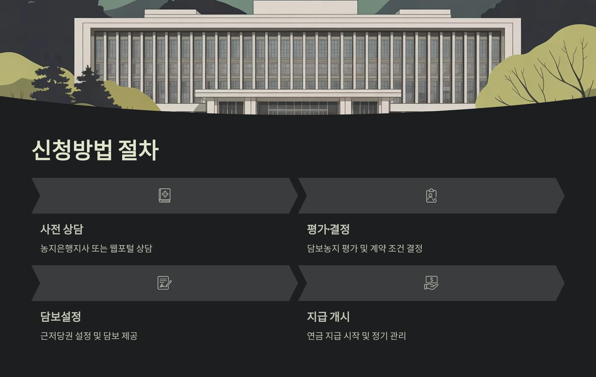 구체적으로는 ①사전 상담 및 신청서 작성 → ②담보농지 평가 및 계약 조건 결정 → ③근저당권 설정 및 담보제공 → ④연금 지급 개시 → ⑤지급 후 정기 보고 및 관리 순서입니다. 신청 시 필요한 서류 준비와 담보농지의 적격 여부가 심사에서 중요한 요소로 작용합니다.