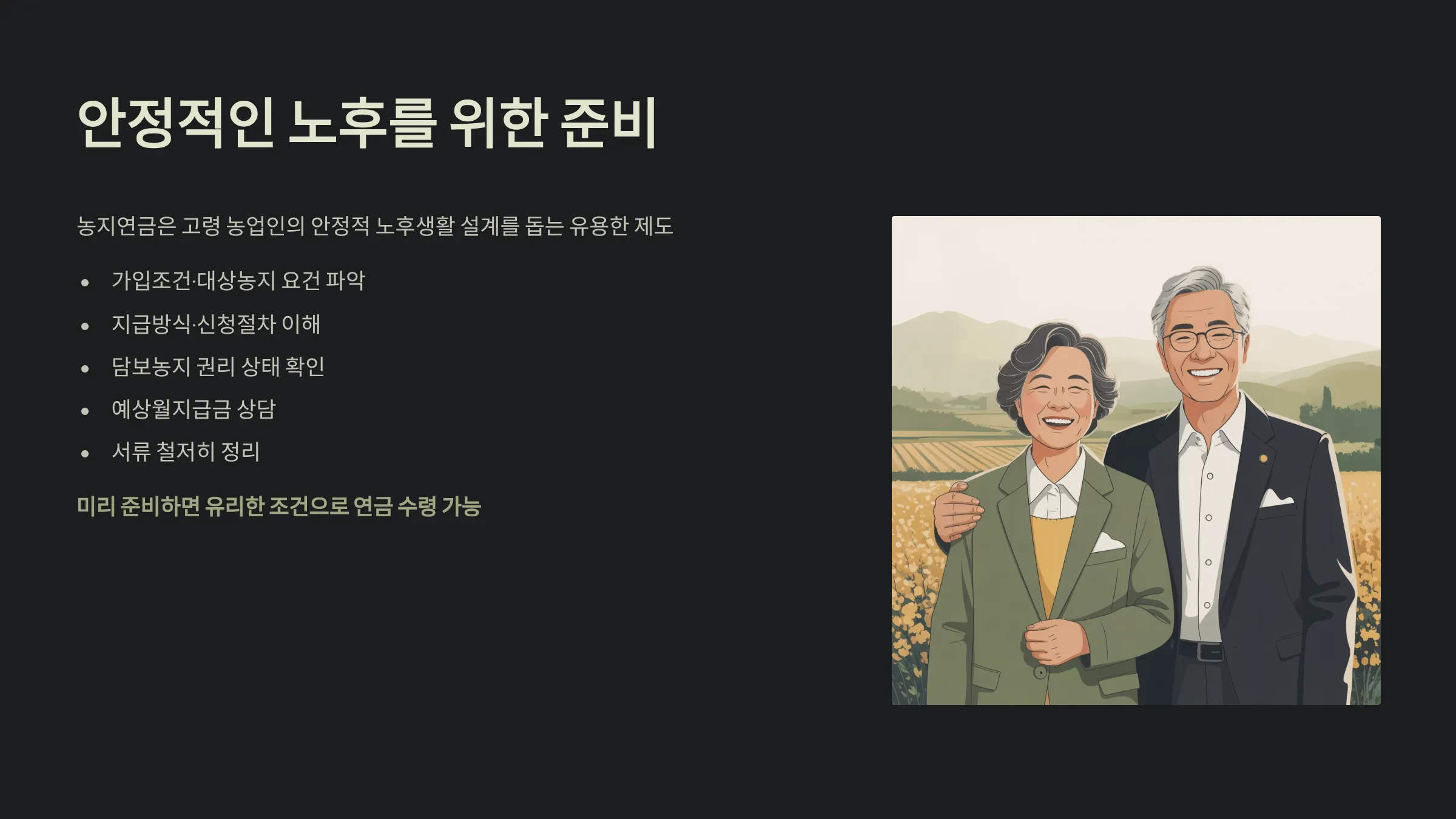 은퇴 후 농지를 소유하고 계신 고령 농업인이라면 농지연금 제도를 통해 안정적인 노후생활을 준비하실 수 있습니다. 농지를 담보로 매월 생활자금을 연금 형태로 수령하는 이 제도는 복잡해 보이지만, 가입조건과 신청방법을 이해하고 차근차근 준비하면 충분히 활용 가능한 제도입니다. 본문에서는 농지연금 가입조건, 농지연금 신청방법, 대상농지 요건, 지급방식 유형, 주의사항까지 최신 정보를 바탕으로 정리해 드립니다.