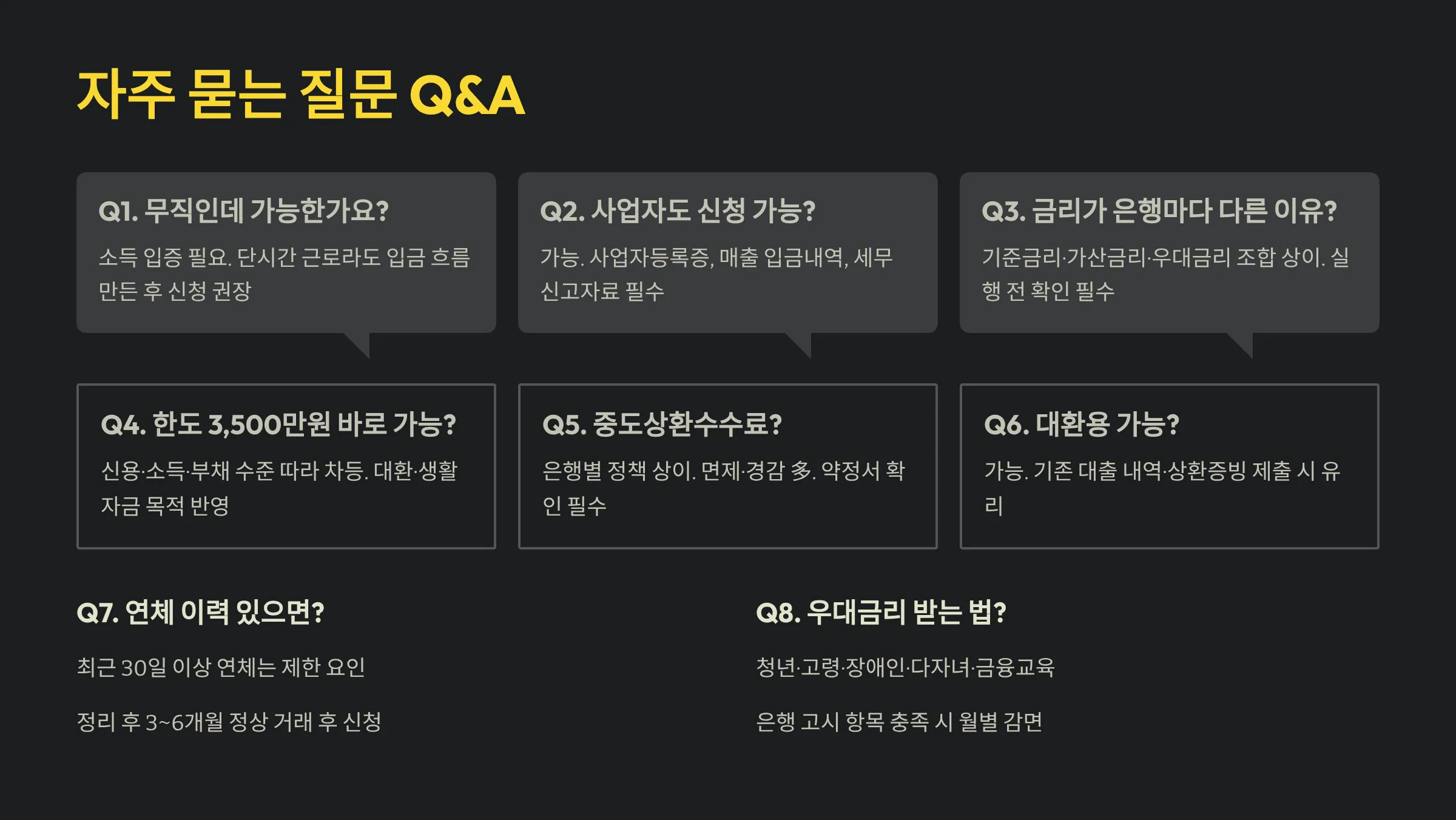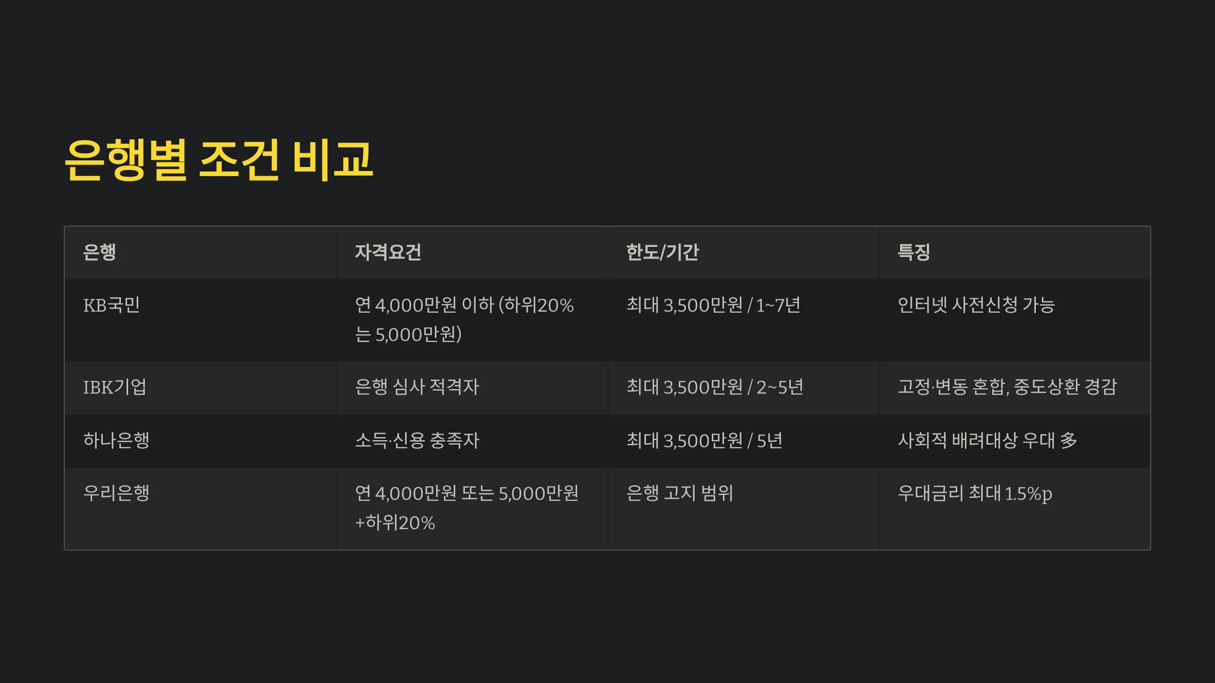 | IBK기업 | 은행 심사 적격자, 소득·신용 요건 | 최대 3,500만원, 2~5년 | 고정·변동 혼합, 중도상환수수료 경감 사례 다수 |