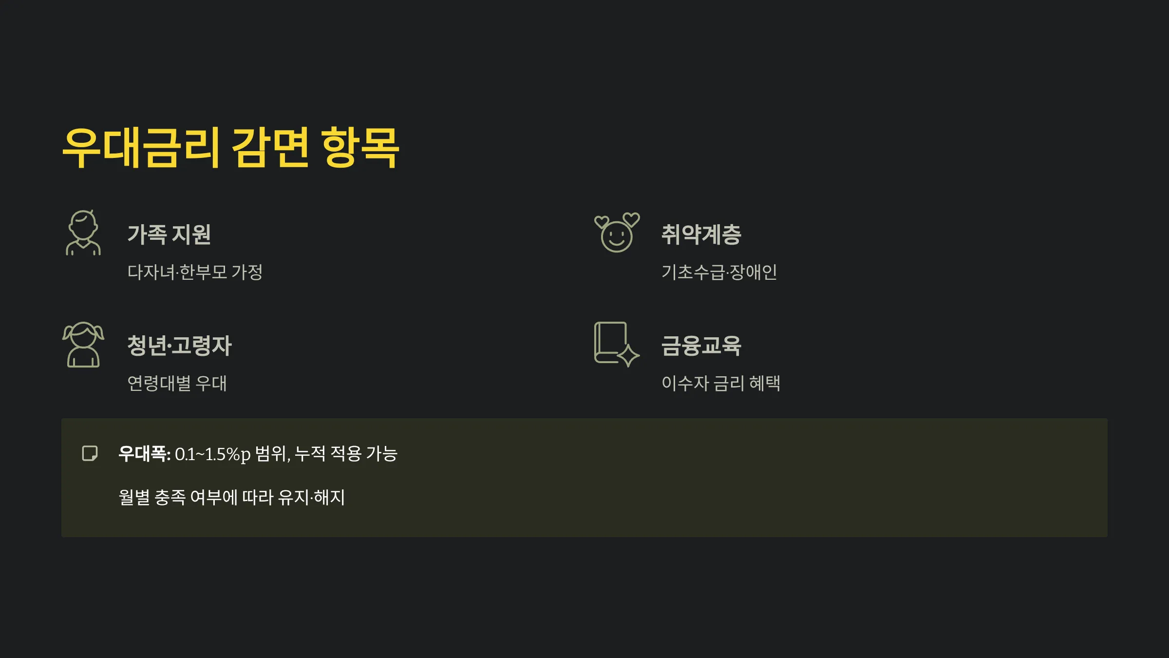 은행들은 취약계층 지원 강화를 위해 다자녀·한부모·기초수급·장애인·청년·고령자·금융교육 이수자 등에게 금리 우대를 제공합니다. 우대폭은 은행별로 다르지만 통상 0.1~1.5%p 범위에서 누적 적용되는 구조가 많습니다.
