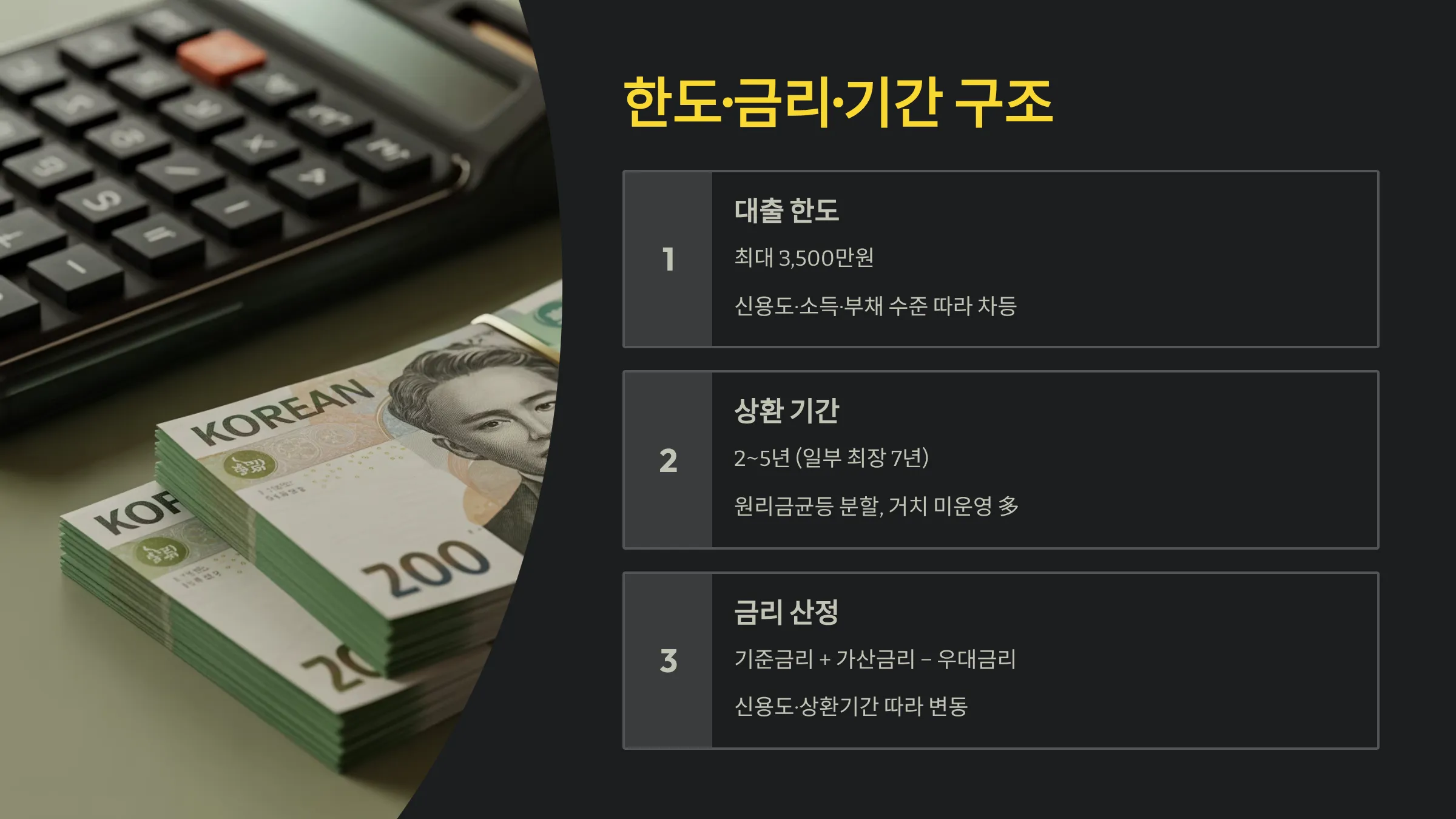 한도는 최대 3,500만원 범위에서 개인 신용도·소득·부채 수준에 따라 차등 산출됩니다. 상환기간은 보통 2~5년(일부 1~7년) 원리금균등 분할이며, 거치기간은 미운영인 은행이 많습니다. 금리는 은행별 기준금리(예: 코리보 등) + 가산금리 − 우대금리로 결정되며, 신용도와 상환기간에 따라 달라집니다.