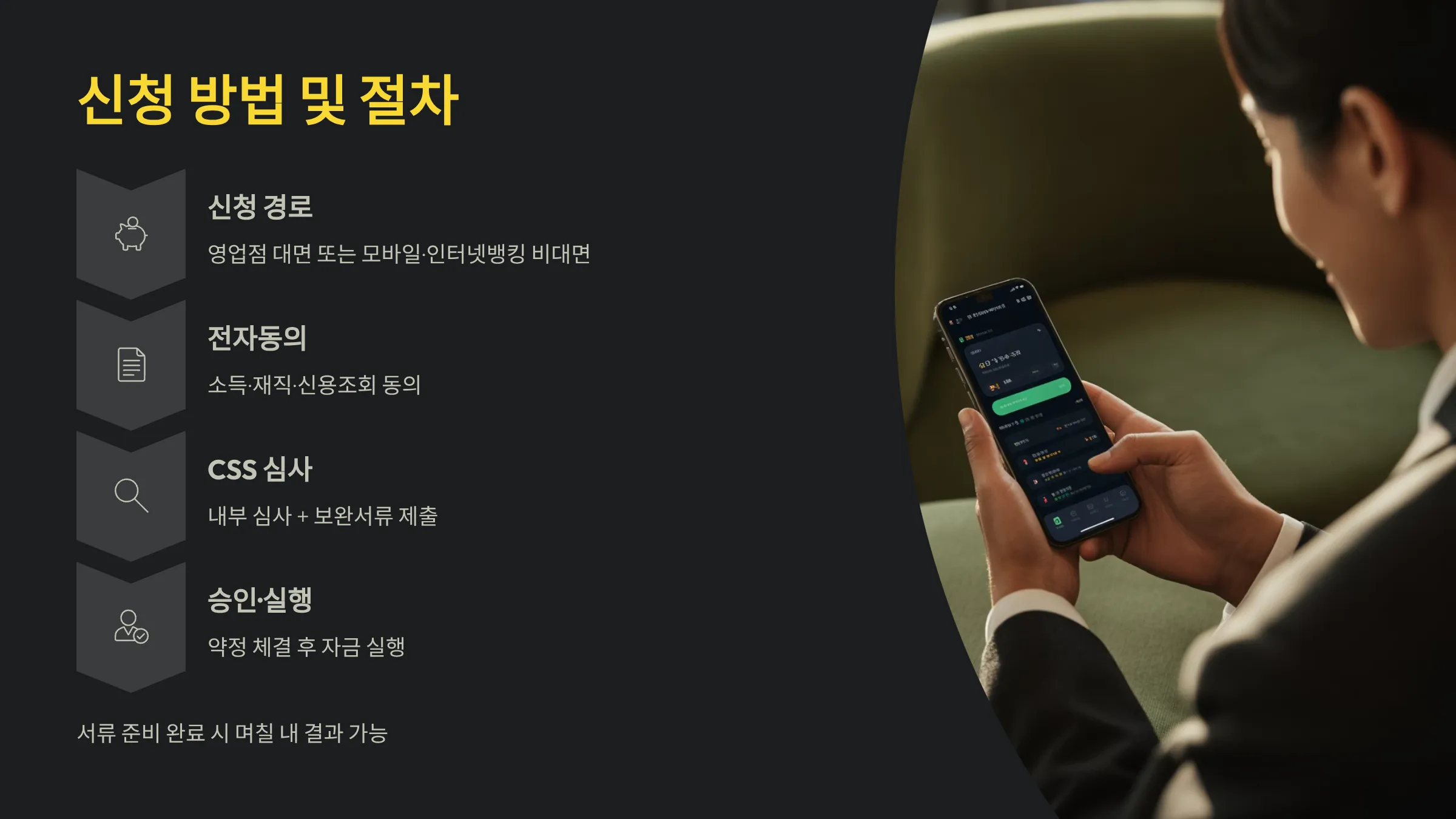 일부 은행은 인터넷 사전신청 후 지점에서 약정을 체결하는 하이브리드 절차를 제공합니다. 전자동의(소득·재직·신용조회) 이후 내부 CSS 심사 → 보완서류 제출 → 승인 통보 → 약정 및 실행 순으로 진행되며, 서류가 깔끔하면 며칠 내 결과가 나올 수 있습니다. 다만 소득 추정이나 매출 확인이 필요한 경우 추가 확인으로 시간이 늘어날 수 있으니, 신청 전 체크리스트를 통해 미리 준비해 두시면 심사 지연을 줄일 수 있습니다.