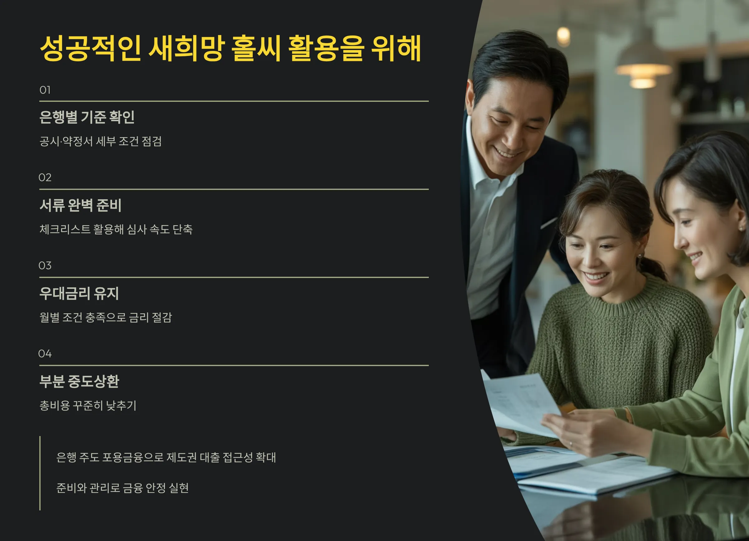 새희망 홀씨는 은행이 직접 취급하는 포용금융으로, 소득·신용 문턱을 낮춰 제도권 대출 접근성을 높여줍니다. 다만 ‘은행별 세부 기준’과 ‘우대금리 유지 조건’이 다르므로 실행 전 반드시 해당 은행 공시와 약정서를 확인하셔야 합니다. 위 요건과 서류, 절차, 승인 팁을 체크리스트처럼 활용해 준비하시면 심사 속도와 결과 모두에서 유리해집니다. 급한 대환이 필요하다면 온라인 사전신청과 지점 약정을 병행해 시간을 단축하시고, 실행 후에는 부분 중도상환과 우대 유지로 총비용을 꾸준히 낮추시기 바랍니다.