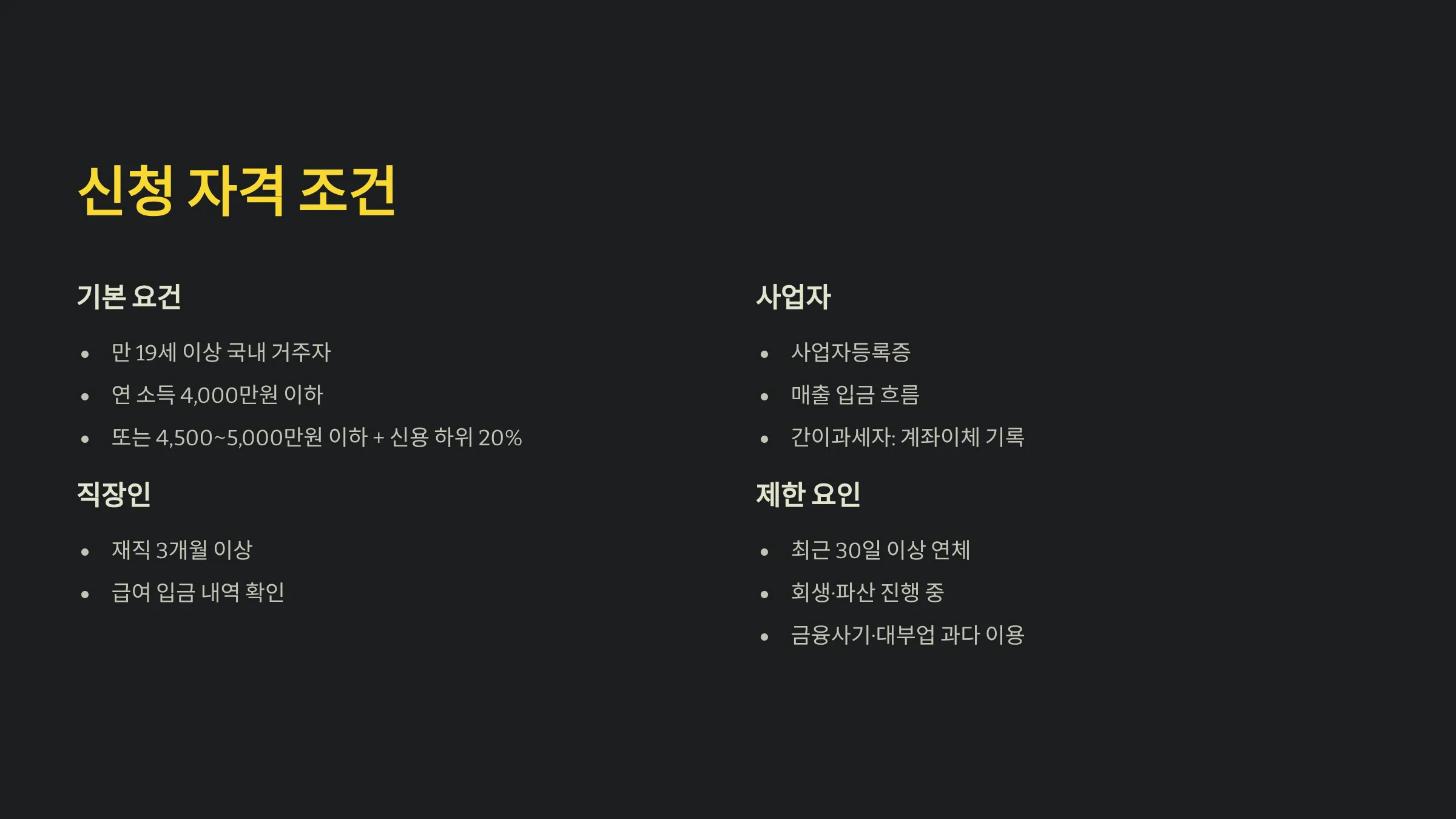 기본적으로 만 19세 이상 국내 거주자여야 하며, 연 소득 4,000만원 이하 또는 연 소득 4,500~5,000만원 이하이면서 신용평점 하위 20%에 해당하면 심사 대상에 포함되는 것이 일반적입니다. 직장인은 재직 3개월 이상 및 급여 입금 내역이 확인되면 유리하고, 사업자는 사업자등록과 매출 입금 흐름, 간이과세자라면 계좌이체 기록 등으로 소득을 입증해야 합니다.