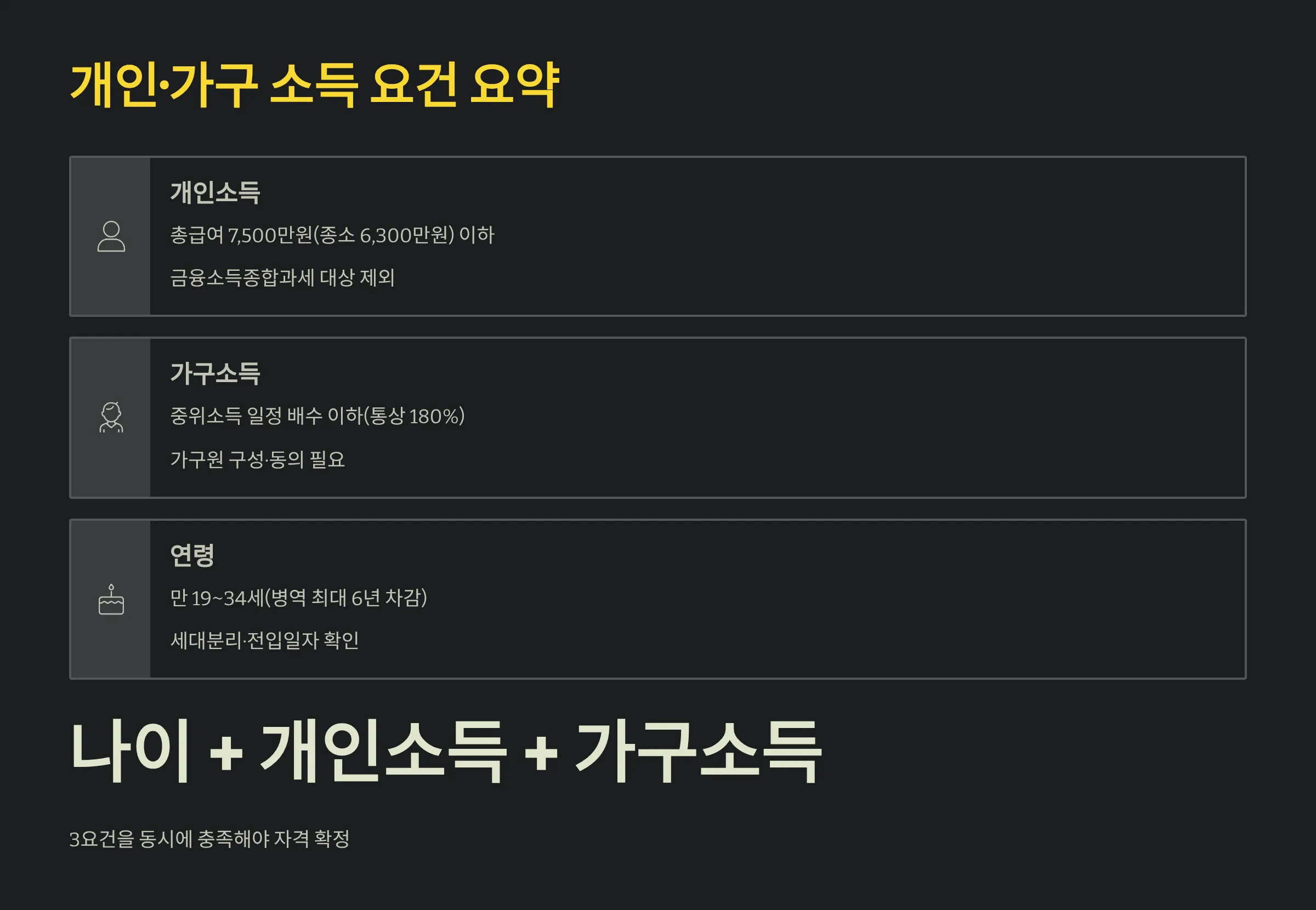 핵심 조건은 연령, 개인소득, 가구소득 세 가지입니다. 연령은 가입일 기준 만 19~34세이며 병역 복무 기간은 최대 6년까지 연령 계산에서 차감됩니다. 개인소득은 직전 과세기간 총급여 7,500만원(종합소득금액 6,300만원) 이하가 기준이며, 가구소득은 보건복지부 고시 기준 중위소득의 일정 배수 이하(통상 180% 기준, 일부 시점 완화 공고 반영 가능)를 충족해야 합니다.