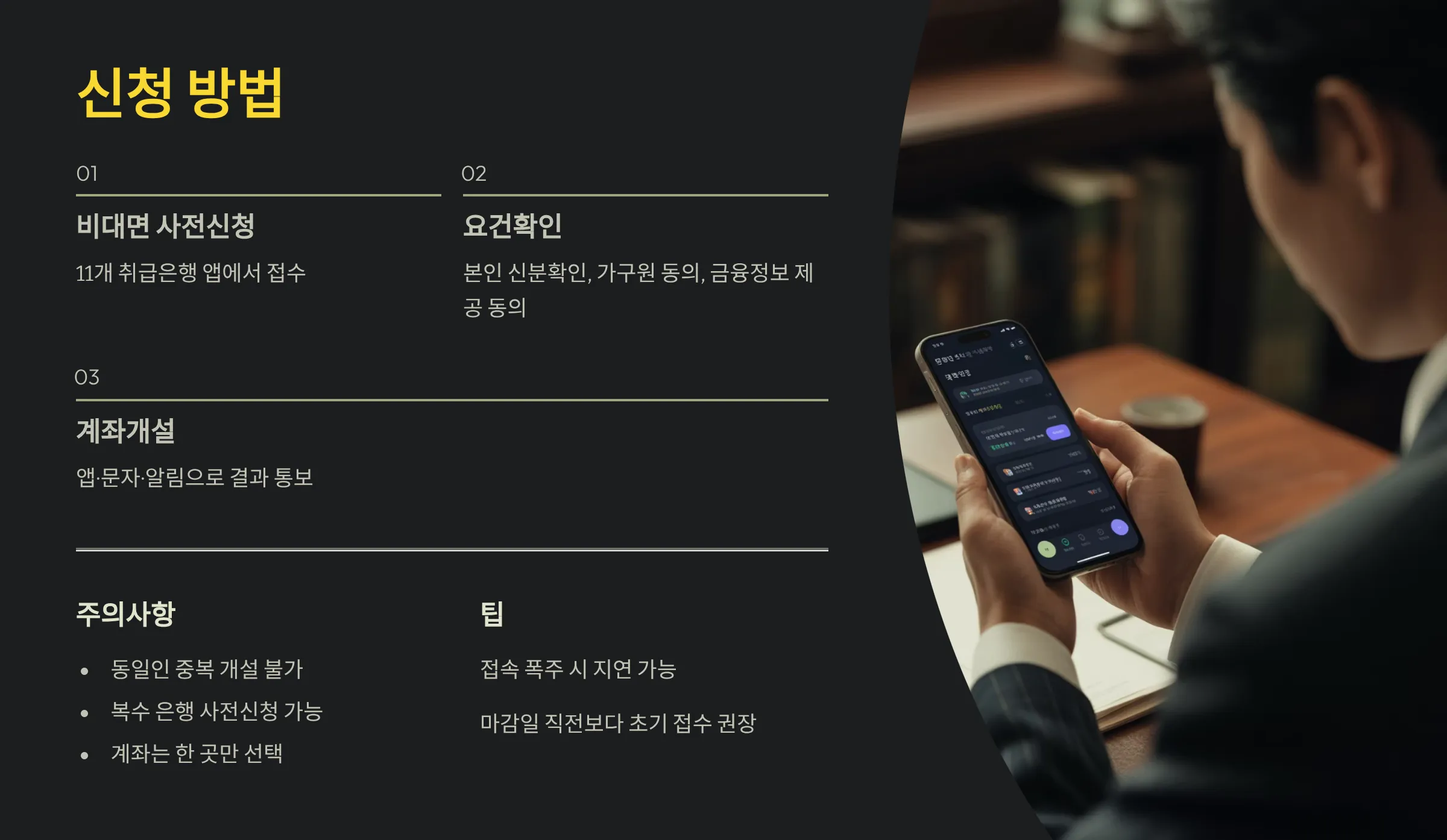 9%금리 청년 도약계좌는 통상 11개 취급은행 앱에서 비대면 사전신청 → 요건확인 → 계좌개설 순으로 진행됩니다. 동일인 중복 개설은 불가하며, 복수 은행에 사전신청은 가능해도 계좌는 한 곳만 선택할 수 있습니다. 신청 단계에서 본인 신분확인, 가구원 동의(가구소득 확인용), 금융정보 제공 동의가 이뤄지고, 결과는 앱·문자·알림으로 통보됩니다. 접속 폭주 시 지연될 수 있으니, 마감일 직전보다는 초기에 접수하는 편이 유리합니다.