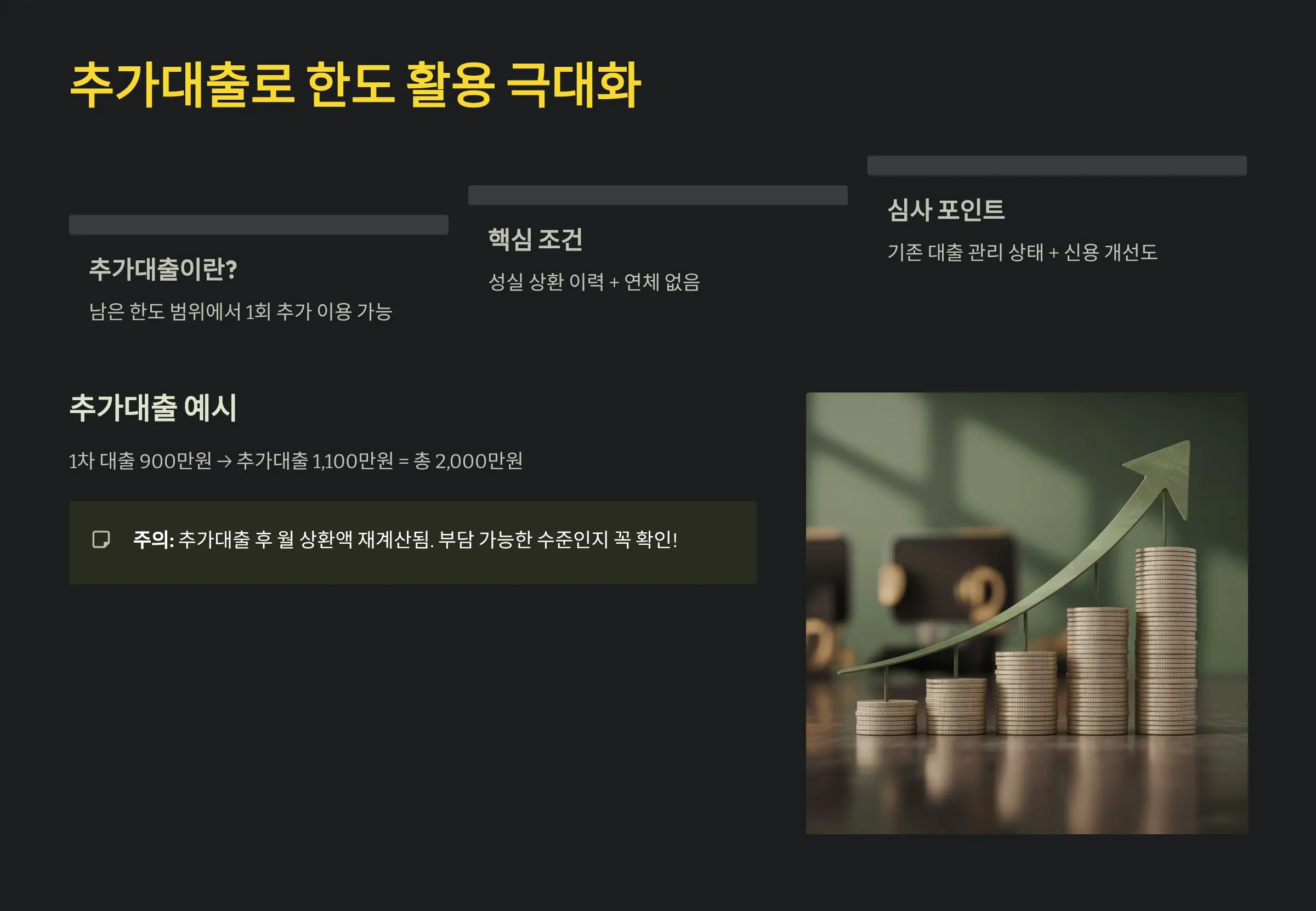 | 추가대출 | 잔여 한도 내에서 1회 | 기존 대출 정상 상환, 신용·부채 개선 | 기존 자금만으로 부족할 때 보충 용도 |
