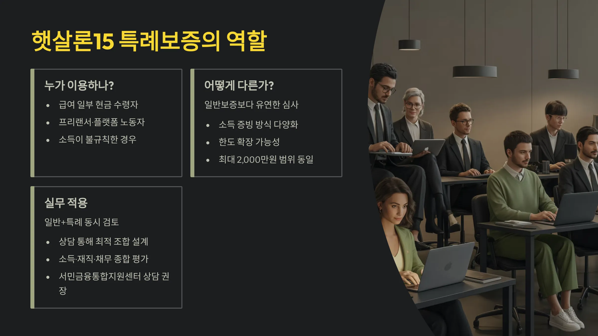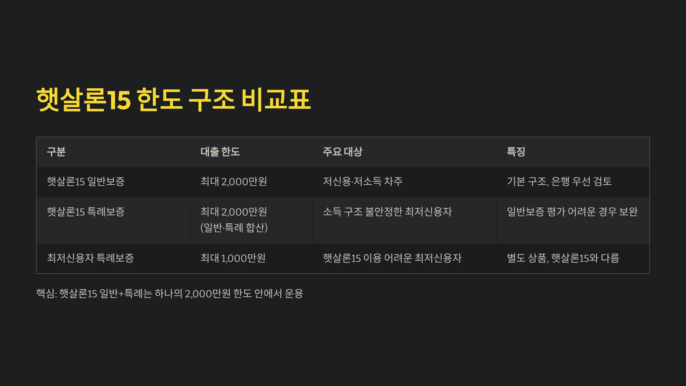 | 햇살론15 특례보증 | 최대 2,000만원(일반·특례 합산) | 소득 구조가 불안정한 최저신용자 | 일반보증으로 평가 어려운 경우 보완 |