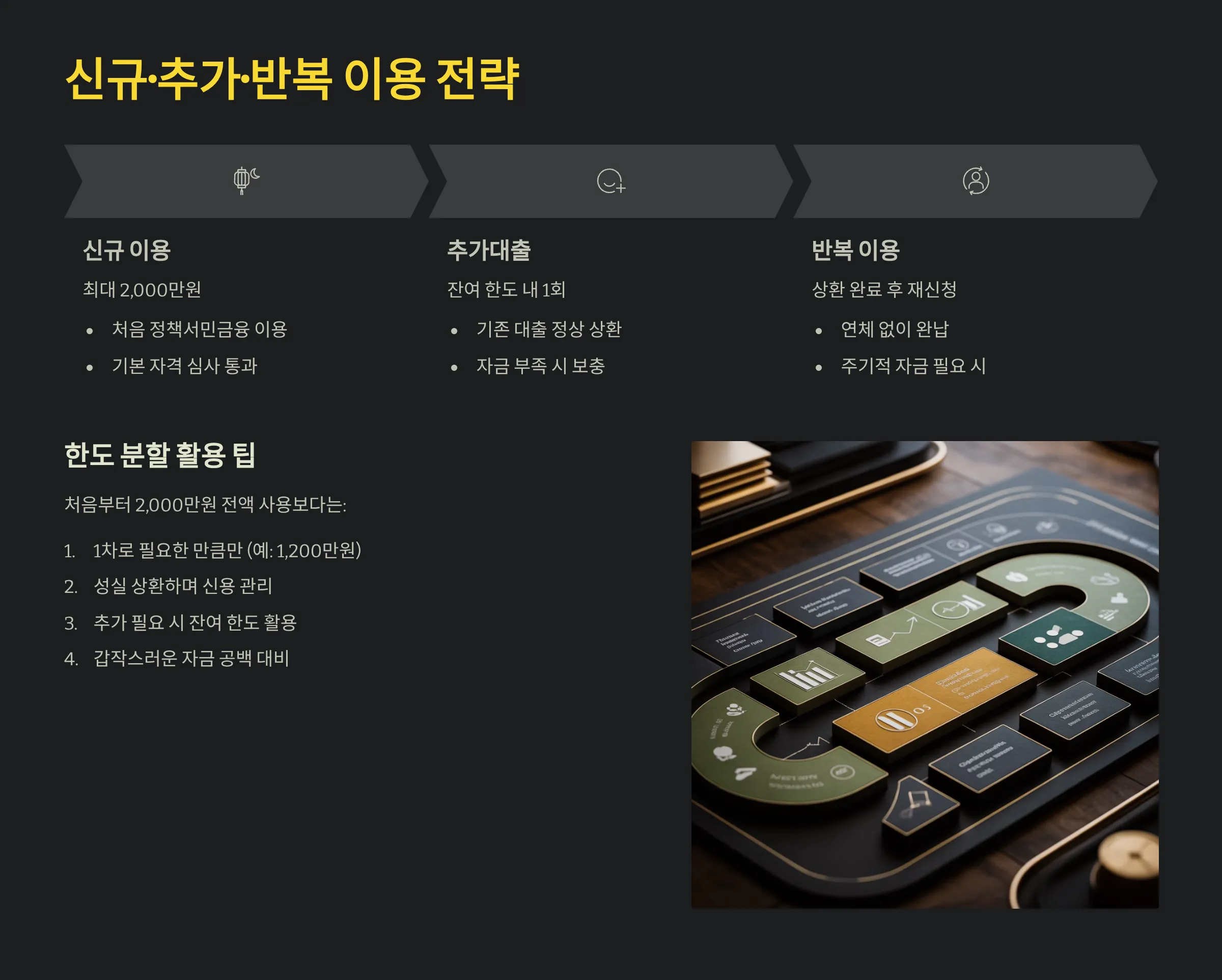 | 신규 이용 | 최대 2,000만원 | 기본 자격 및 심사 통과 | 처음 정책서민금융을 이용하는 경우 |