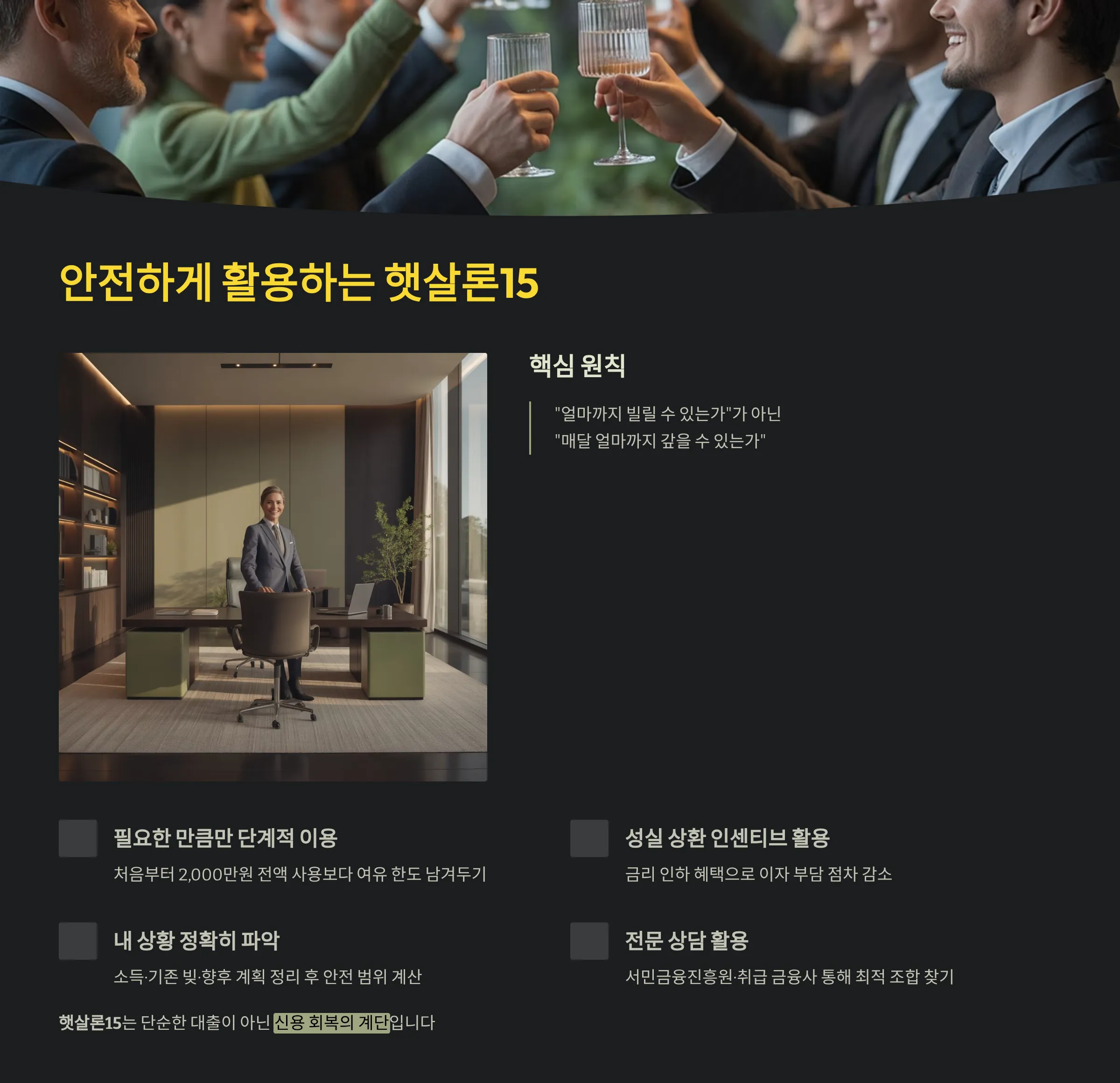 | 반복 이용 | 상환 완료 후 다시 최대 2,000만원 | 직전 햇살론15를 연체 없이 상환 | 주기적으로 자금이 필요하지만 성실 상환 가능한 경우 |
