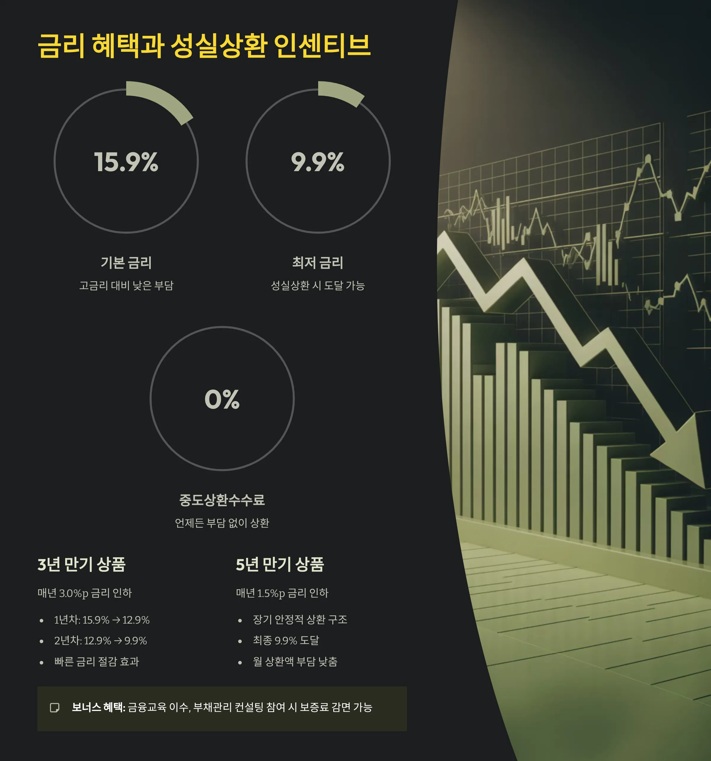 3년 만기 상품을 선택하면 매년 일정 금액을 연체 없이 상환했을 때 금리가 3.0%포인트씩 내려가고, 5년 만기 상품을 선택하면 매년 1.5%포인트씩 금리가 인하되어 최종적으로는 연 9.9%까지 내려갈 수 있습니다. 성실하게 갚을수록 이자 부담이 점점 줄어드는 구조라, 장기적으로 빚을 정리하고 신용을 회복하려는 사람에게 유리한 설계입니다. 또 일부 은행에서는 금융교육 이수나 신용·부채관리 컨설팅 참여 여부에 따라 보증료를 일부 감면해 주기도 합니다.