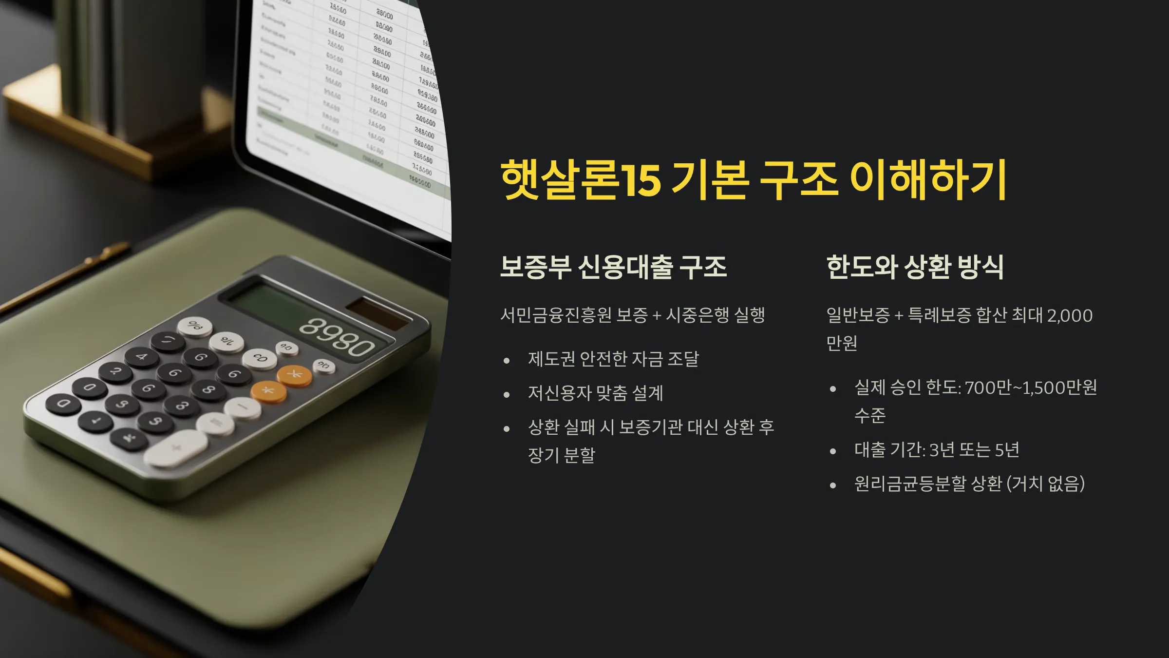 햇살론15는 고금리 대출을 이용할 수밖에 없는 최저신용자를 위해 만들어진 정책서민금융 상품으로, 일반보증과 특례보증을 합쳐 최대 2,000만원까지 이용할 수 있고 상황에 따라 추가대출도 한 번 더 받을 수 있습니다. 한도를 어떻게 나누어 쓰느냐, 언제 추가대출을 활용하느냐에 따라 부담은 크게 달라지기 때문에, 햇살론15의 구조와 특례보증·추가대출 규칙을 정확히 이해하고 내 소득·부채 수준에 맞는 전략을 세우는 것이 중요합니다.