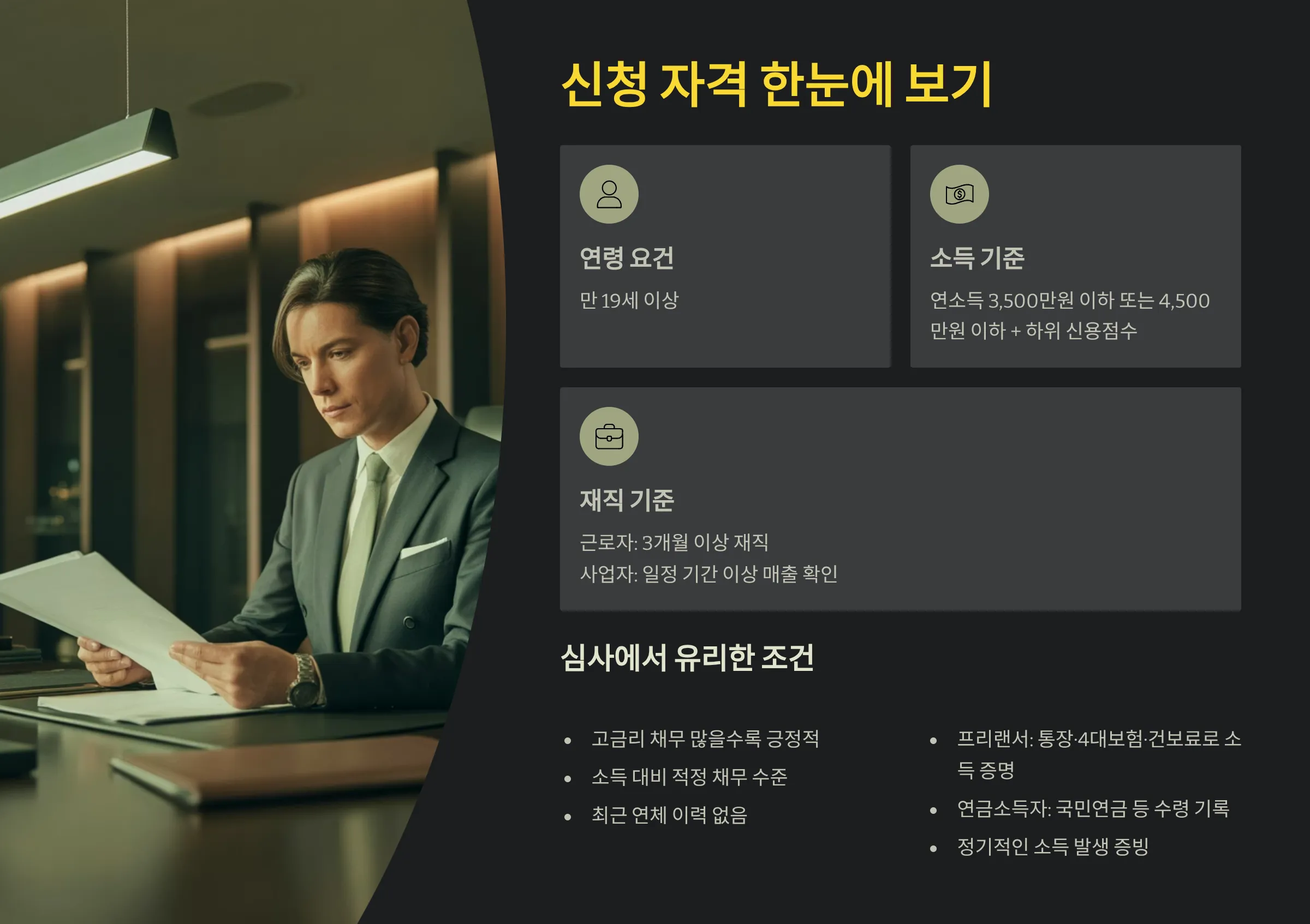 소득 기준을 보면, 일반적으로 연소득 3,500만원 이하이거나 연소득 4,500만원 이하이면서 개인 신용점수가 하위 구간에 속하는 경우가 대상이 됩니다. 여기에 더해 대부업·카드론·현금서비스 등 고금리 채무를 많이 이용하고 있을수록 햇살론15의 정책 취지와 맞아 심사에서 긍정적으로 반영되는 면도 있습니다. 다만 소득 규모에 비해 채무 총액이 지나치게 과도하거나, 최근 연체가 반복된 이력이 있다면 승인 가능성은 낮아집니다.