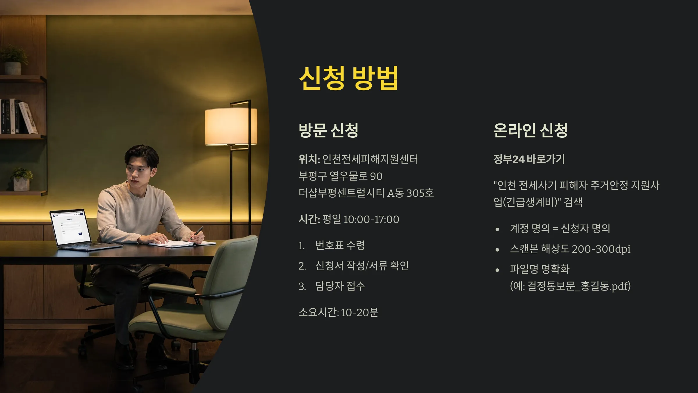 방문은 인천전세피해지원센터(부평구 열우물로 90, 더샵부평센트럴시티 A동 305호, 평일 10:00~17:00)에서 접수합니다. 번호표 수령 → 신청서 작성/서류 확인 → 담당자 접수 순으로 간단하며, 서류가 완비됐다면 10~20분 내 절차를 마칠 수 있습니다. 온라인정부24 바로가기 “인천 전세사기 피해자 주거안정 지원사업(긴급생계비)”를 검색해 로그인 후 전자신청을 진행하면 됩니다. 계정 명의와 신청자 명의 일치, 스캔본의 해상도(가급적 200~300dpi), 파일명 명확화(예: 결정통보문_홍길동.pdf)만 지켜도 반려 가능성을 현저히 줄일 수 있습니다. 지금 본인의 상황에 맞는 경로를 선택해 접수하시길 권합니다.