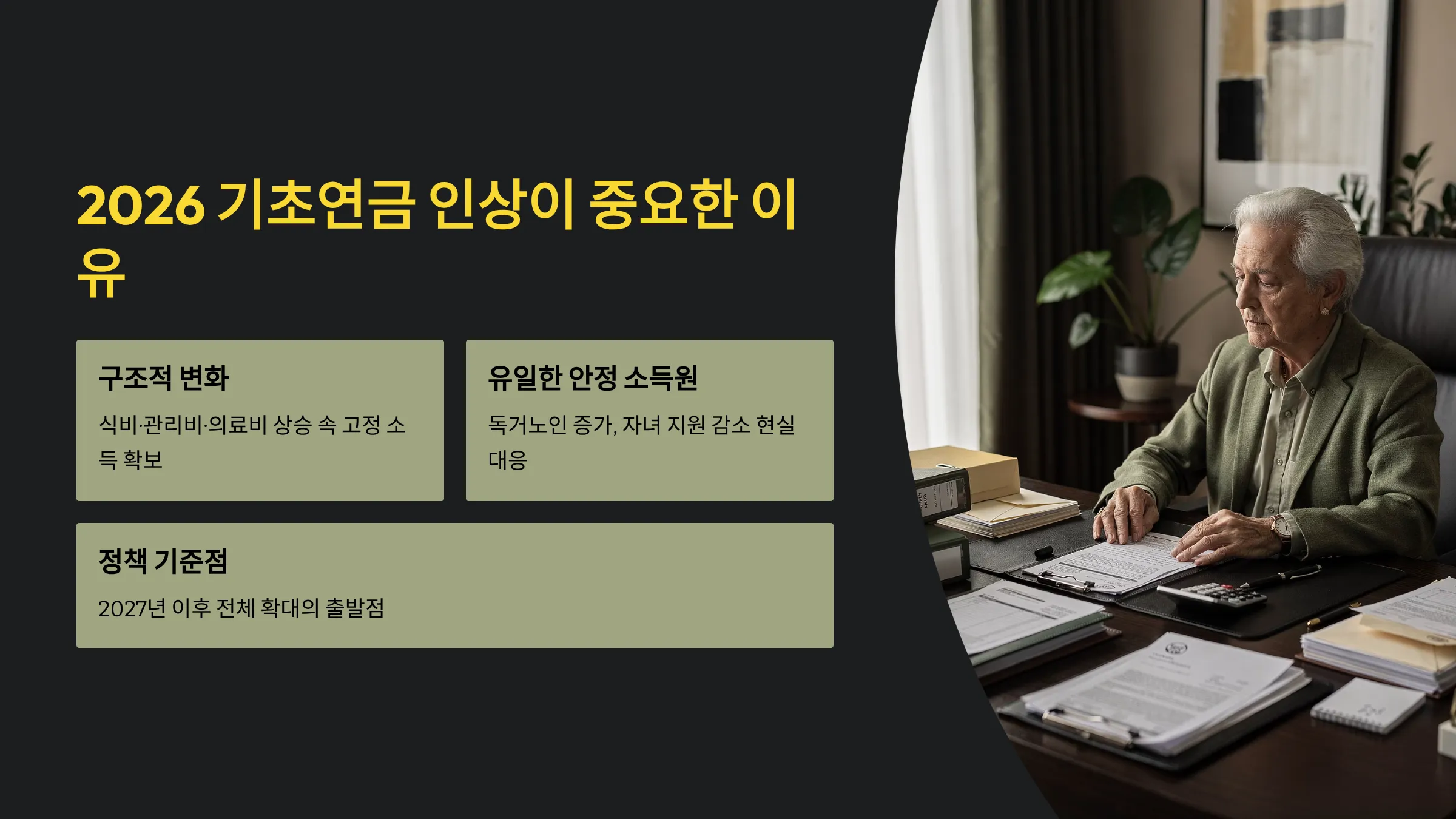 아닙니다. 2026년에는 저소득층 우선 인상이 적용되며, 전체 확대는 2027년 이후 예정입니다. 소득인정액과 재산 상황에 따라 수급 여부가 달라지므로 반드시 본인 기준을 다시 확인해야 합니다.