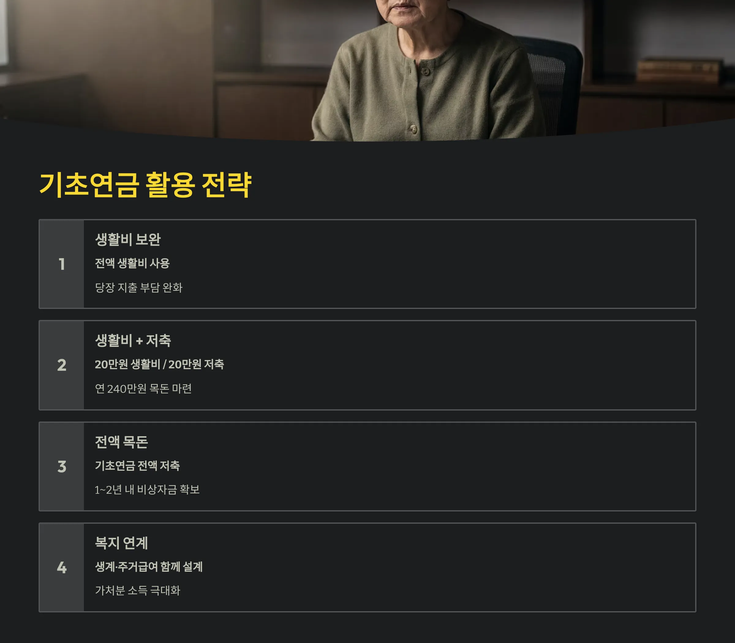 | 전액 목돈 전략 | 기초연금 전액 저축 | 1~2년 내 대규모 비상자금 확보 | 다른 소득원이 안정적일 때만 가능 |