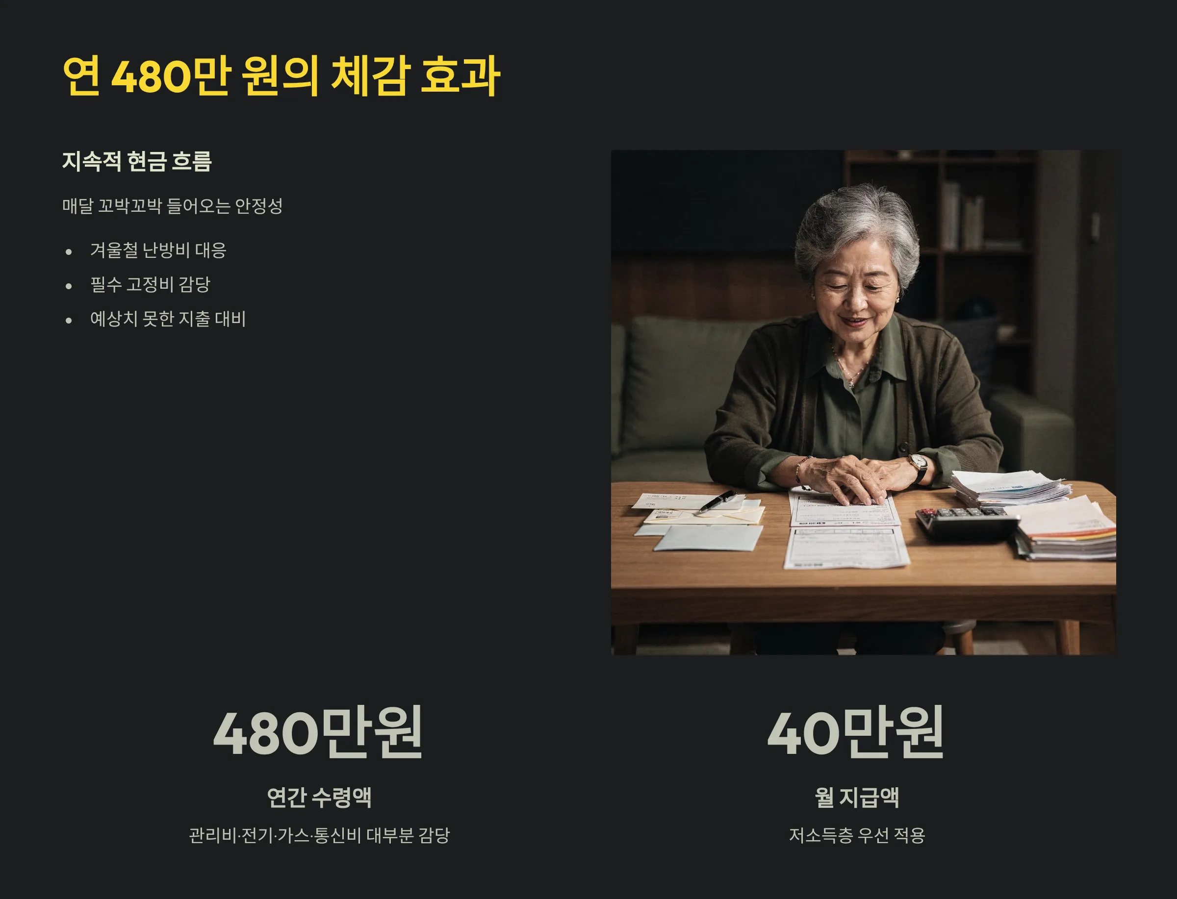 연 480만 원을 기준으로 보면, 1년 동안 관리비·전기·가스·통신비 같은 필수 고정비 대부분을 감당할 수 있습니다. 또한 국민연금이 적거나 없는 경우에는 이 연 480만 원이 전체 생활비의 상당 부분을 차지할 수 있어 실질 가계 안정 효과가 더욱 커집니다. 반대로 국민연금이 일정 수준 있다면 기초연금 40만 원은 의료비나 비상자금, 주거보수 같은 예상치 못한 지출을 안정적으로 대비하게 하는 역할을 합니다.