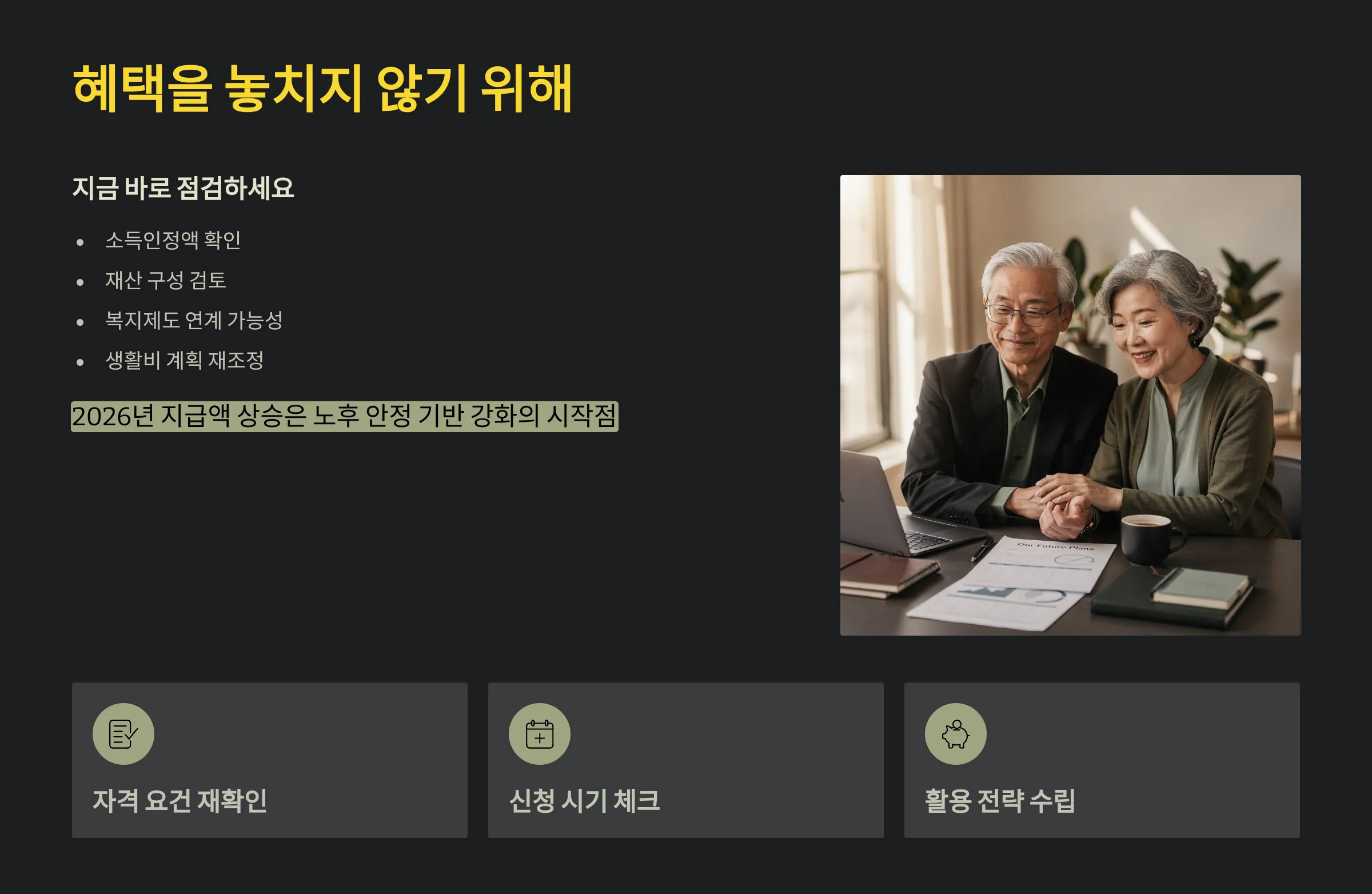 특히 독거노인이 증가하고 자녀 지원 감소가 가속화되는 현실에서, 기초연금은 부족한 생활비를 채워주는 거의 유일한 안정적 소득원으로 기능하고 있습니다. 따라서 이번 인상은 노후 빈곤 위험을 완화하고, 최소한의 경제적 자립 기반을 제공하는 데 큰 의미가 있습니다. 2026년 인상 폭은 이후 기초연금 정책 전반의 기준이 될 가능성이 높아, 지금부터 흐름을 잡아두면 2027년 이후 전체 확대 시점에도 훨씬 유리합니다.