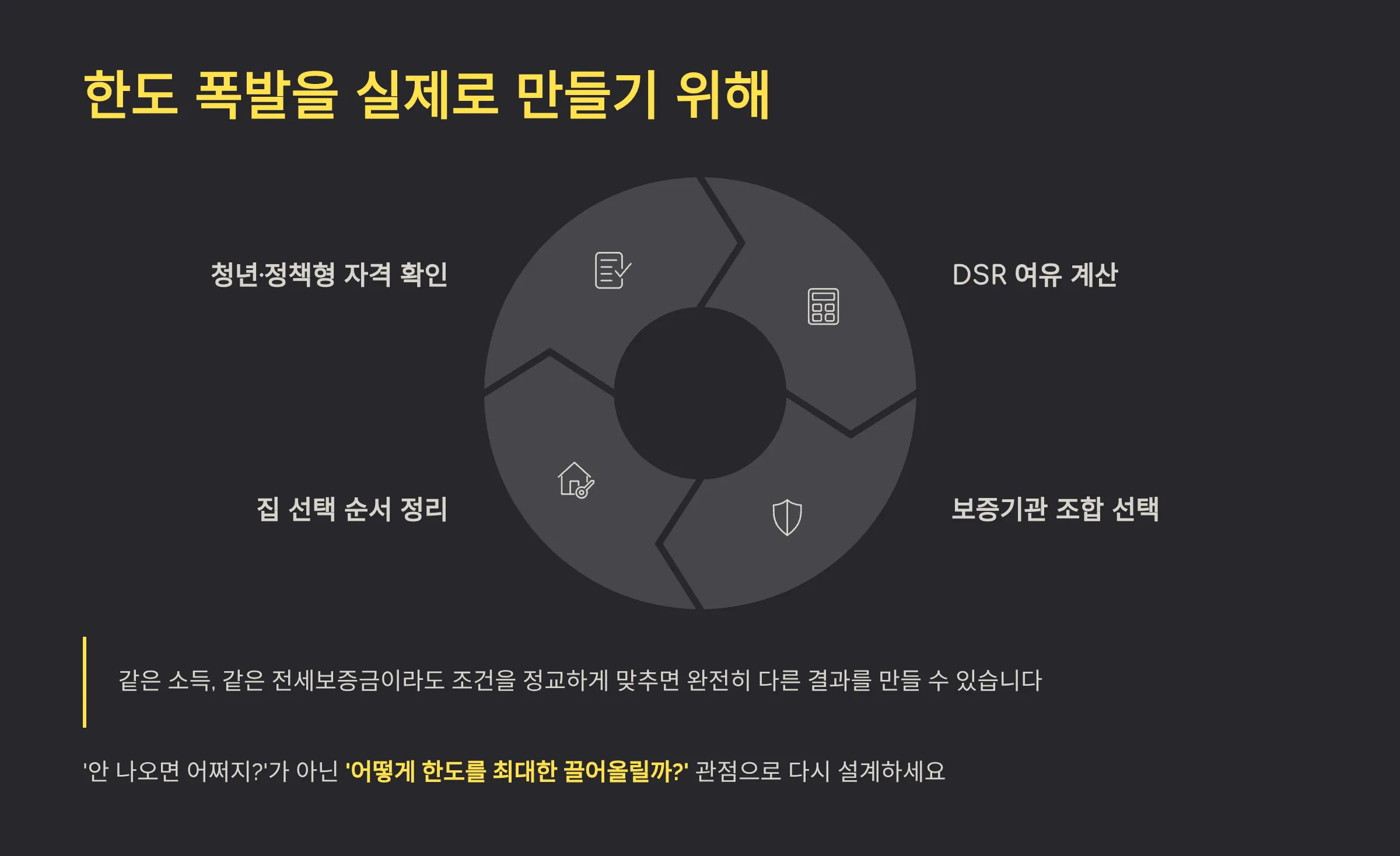 청년·정책형 자격부터 DSR 여유, 보증기관 조합, 집 선택 순서까지 하나씩 정리해 나가다 보면, 같은 소득과 같은 전세보증금인데도 전혀 다른 결과를 만들어낼 수 있습니다.
