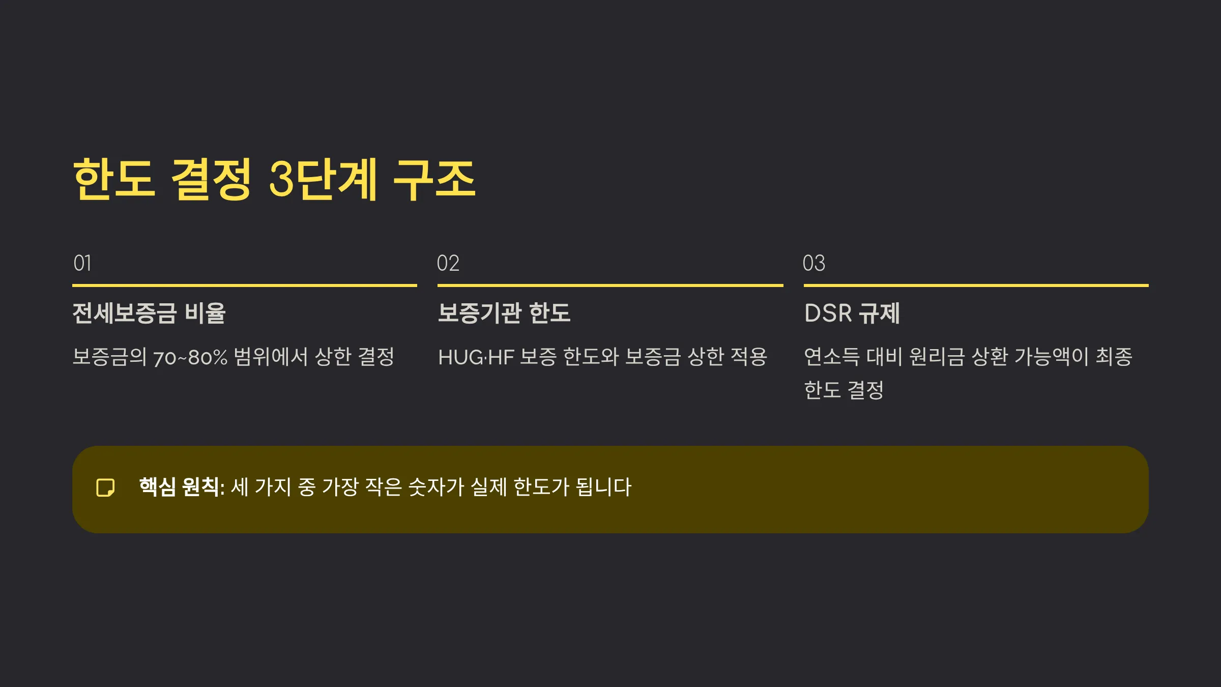 전세자금대출 한도는 겉으로 보기에는 단순해 보이지만 실제로는 세 단계의 필터를 통과하며 결정됩니다.