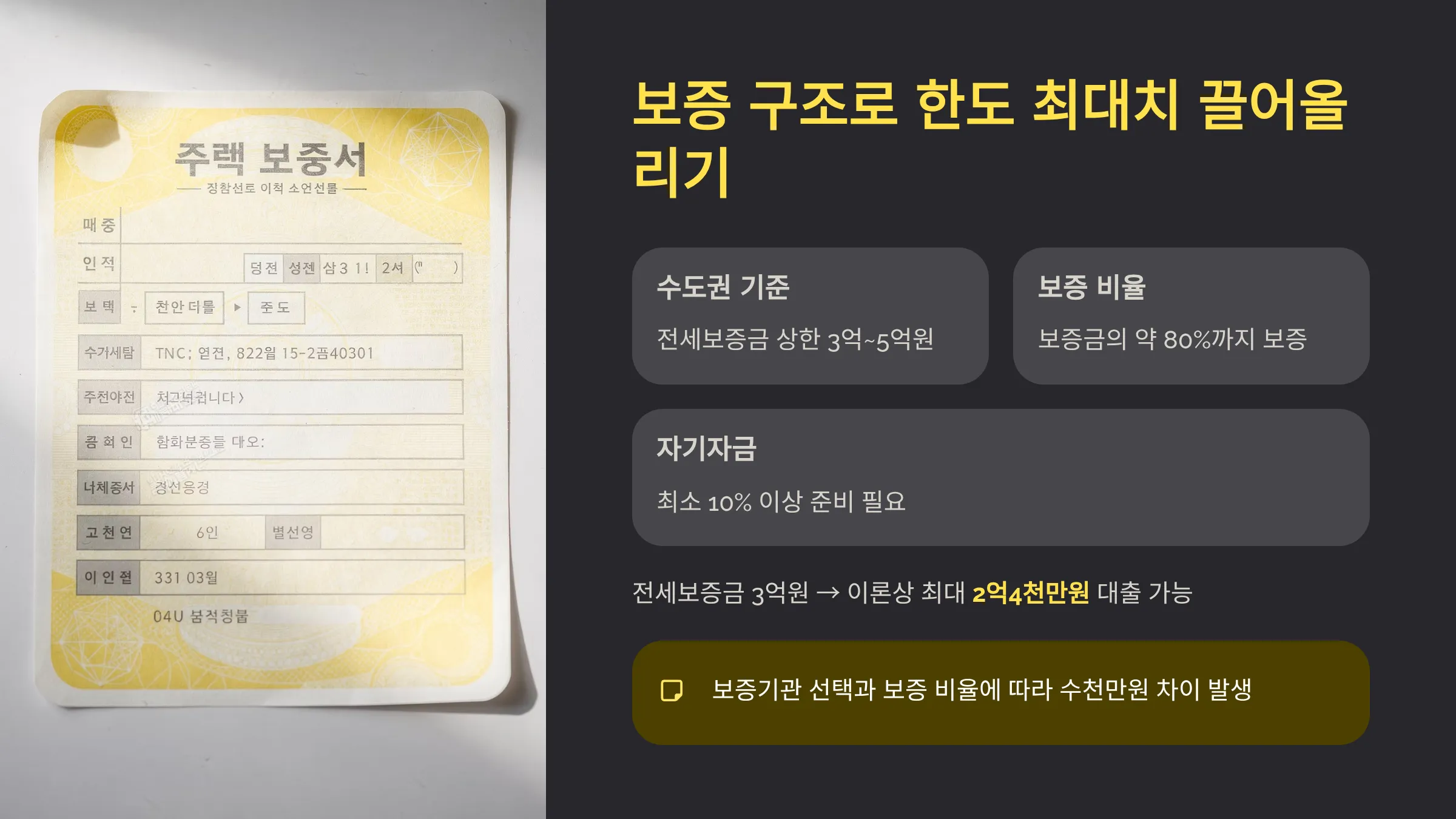 같은 전세보증금이라도 보증기관 선택과 보증 비율에 따라 전세자금대출 한도는 수천만원씩 차이 날 수 있으니, 반드시 상품 설명서를 꼼꼼히 비교해 보셔야 합니다.