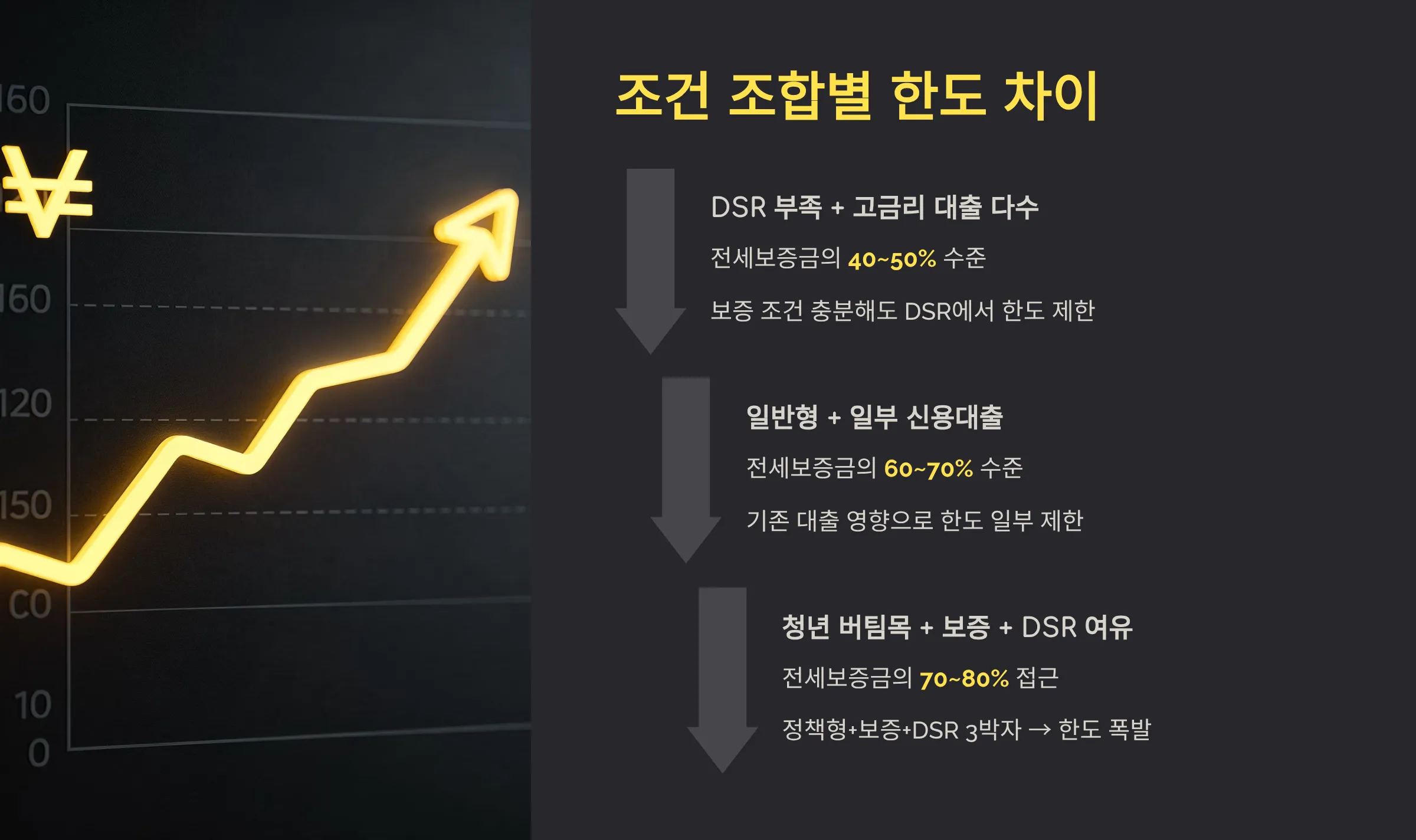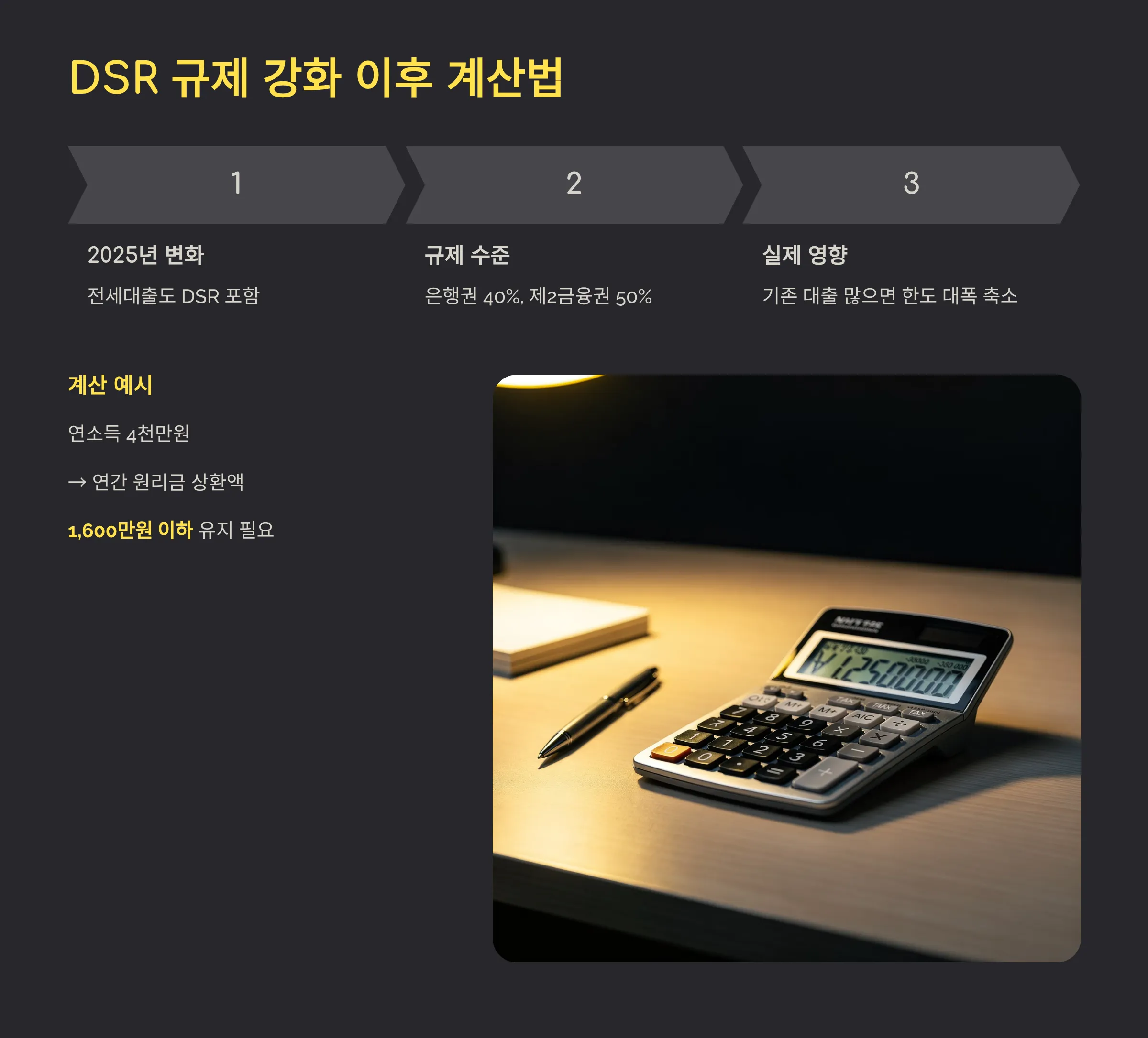 세 번째는 2025년부터 더 강화된 DSR 규제입니다. 전세대출도 DSR에 포함되면서 연소득 대비 원리금 상환 가능액이 실제 한도를 결정하는 중요한 마지막 변수로 작용합니다.