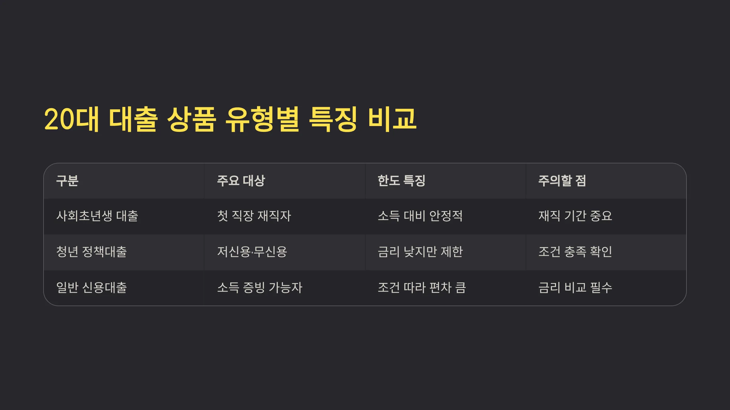 이 표를 보면 20대 대출은 무작정 아무 상품이나 선택하는 것이 아니라, 본인 상황에 맞는 유형을 고르는 것이 핵심이라는 점을 알 수 있습니다. 지금 내 위치가 어디인지부터 확인해보는 것이 중요합니다.