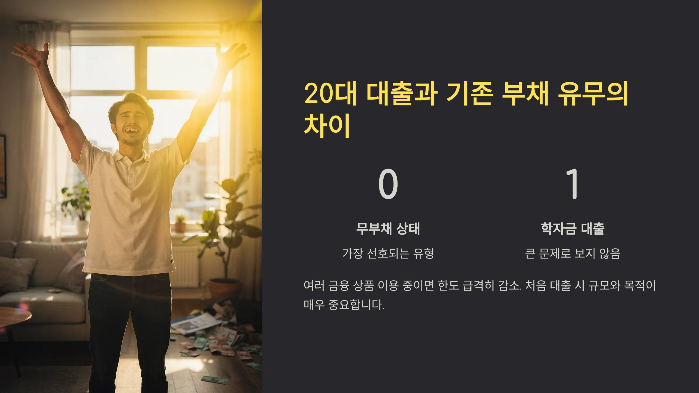 같은 20대라도 기존 부채가 있는 경우와 없는 경우는 평가가 완전히 다릅니다. 20대 대출에서 가장 선호되는 유형은 ‘무부채 또는 저부채’ 상태입니다. 학자금 대출 정도만 있는 경우라면 큰 문제로 보지 않지만, 이미 여러 금융 상품을 이용 중이라면 한도가 급격히 줄어들 수 있습니다.