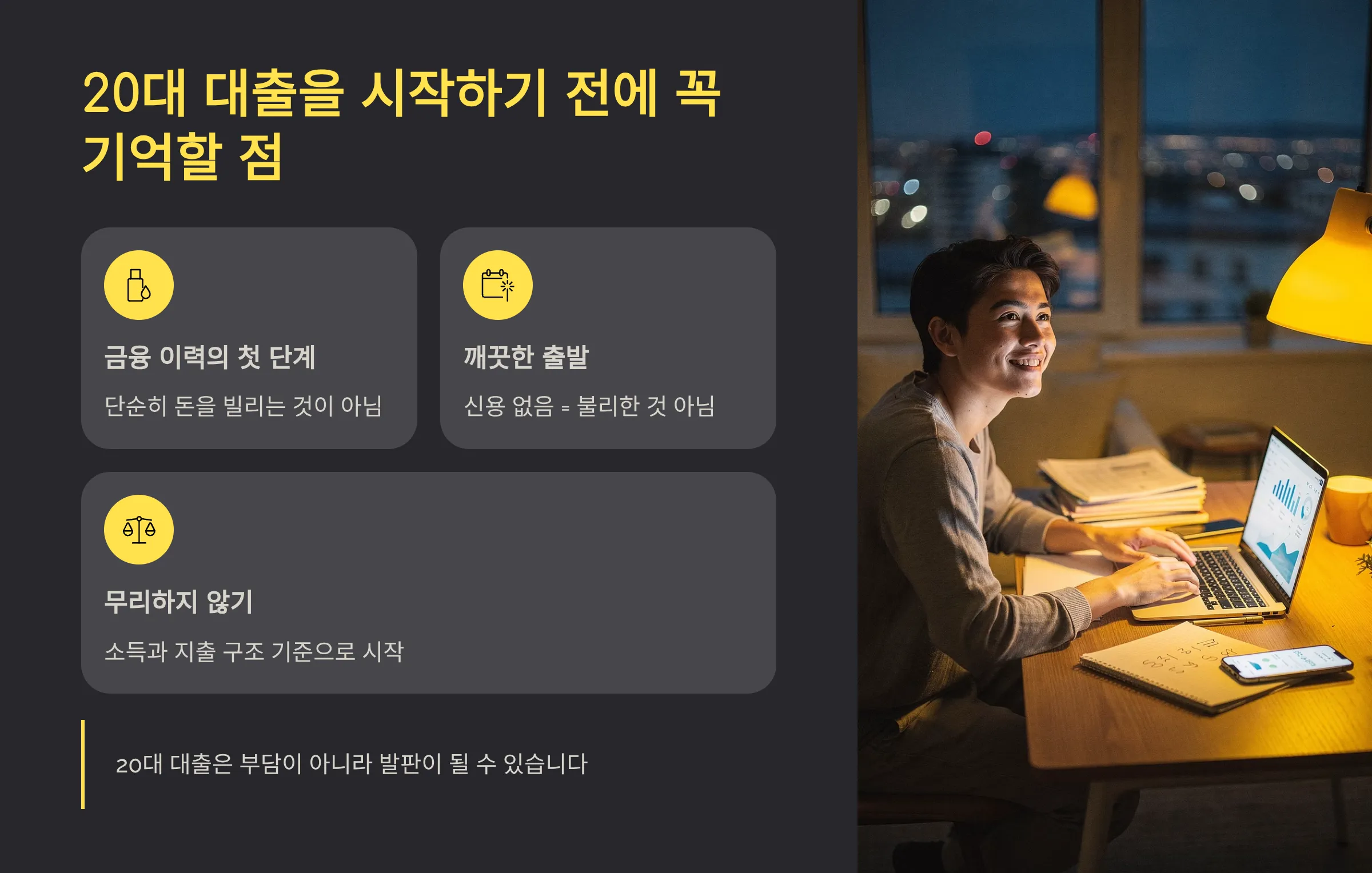 지금 이 구조를 제대로 이해하고 접근한다면, 20대 대출은 부담이 아니라 발판이 될 수 있습니다. 오늘 기준으로 한 번만 더 꼼꼼히 확인해보시기 바랍니다.