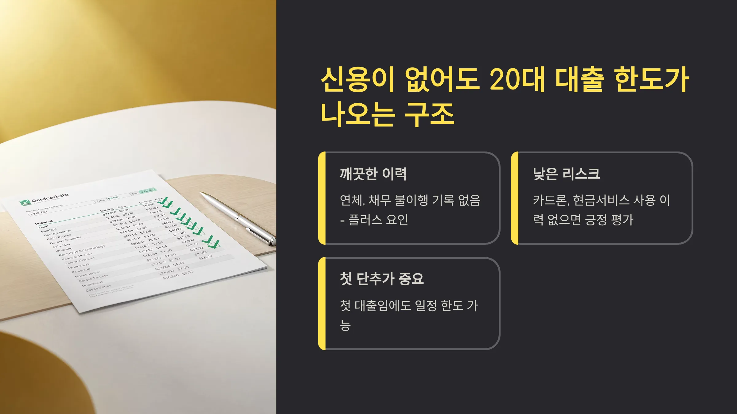 20대 대출은 신용점수가 없거나 금융 이력이 거의 없는 상태에서도 의외로 한도가 나오는 경우가 많습니다. 많은 분들이 “신용이 없으면 대출은 불가능하다”고 생각하지만, 실제 금융 심사 구조는 점수 하나로만 판단되지 않습니다. 특히 사회초년생, 취업 초기, 군 전역 직후처럼 금융 이력이 얇은 20대 대출 신청자는 별도의 평가 기준으로 심사가 진행되는 경우가 많습니다. 이 구조를 이해하면 왜 신용이 없어도 한도가 나오는지, 반대로 어디서 막히는지를 명확히 볼 수 있습니다. 지금부터 20대 대출이 가능한 핵심 이유부터 차분히 정리해보시기 바랍니다.
