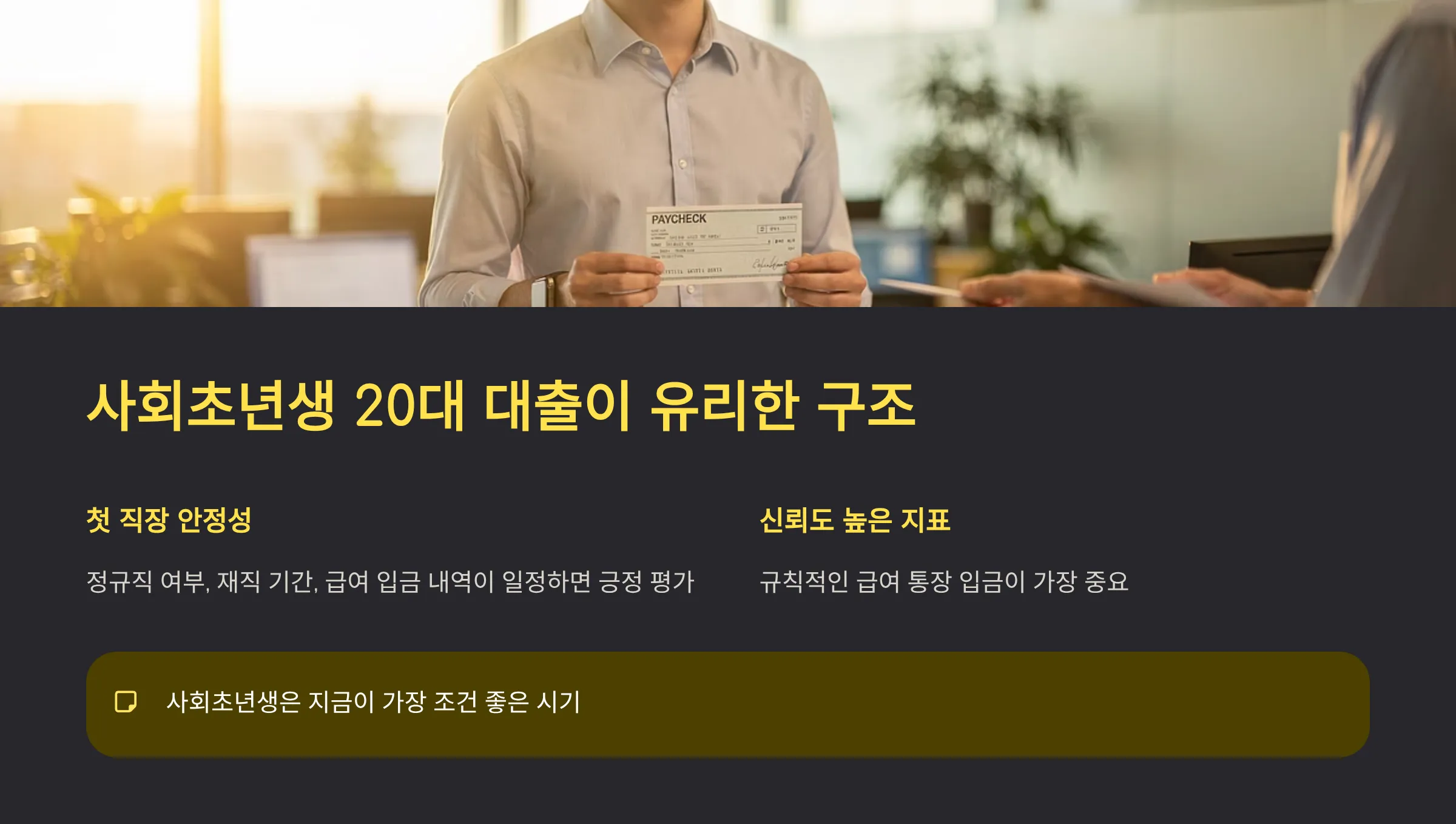 사회초년생은 대출 심사에서 불리할 것 같지만, 실제로는 그렇지 않습니다. 20대 대출 중 상당수는 ‘첫 직장 안정성’을 긍정적으로 평가합니다. 정규직 여부, 재직 기간, 급여 입금 내역이 일정하다면 과거 신용이 없더라도 충분한 상환 능력이 있다고 판단합니다.