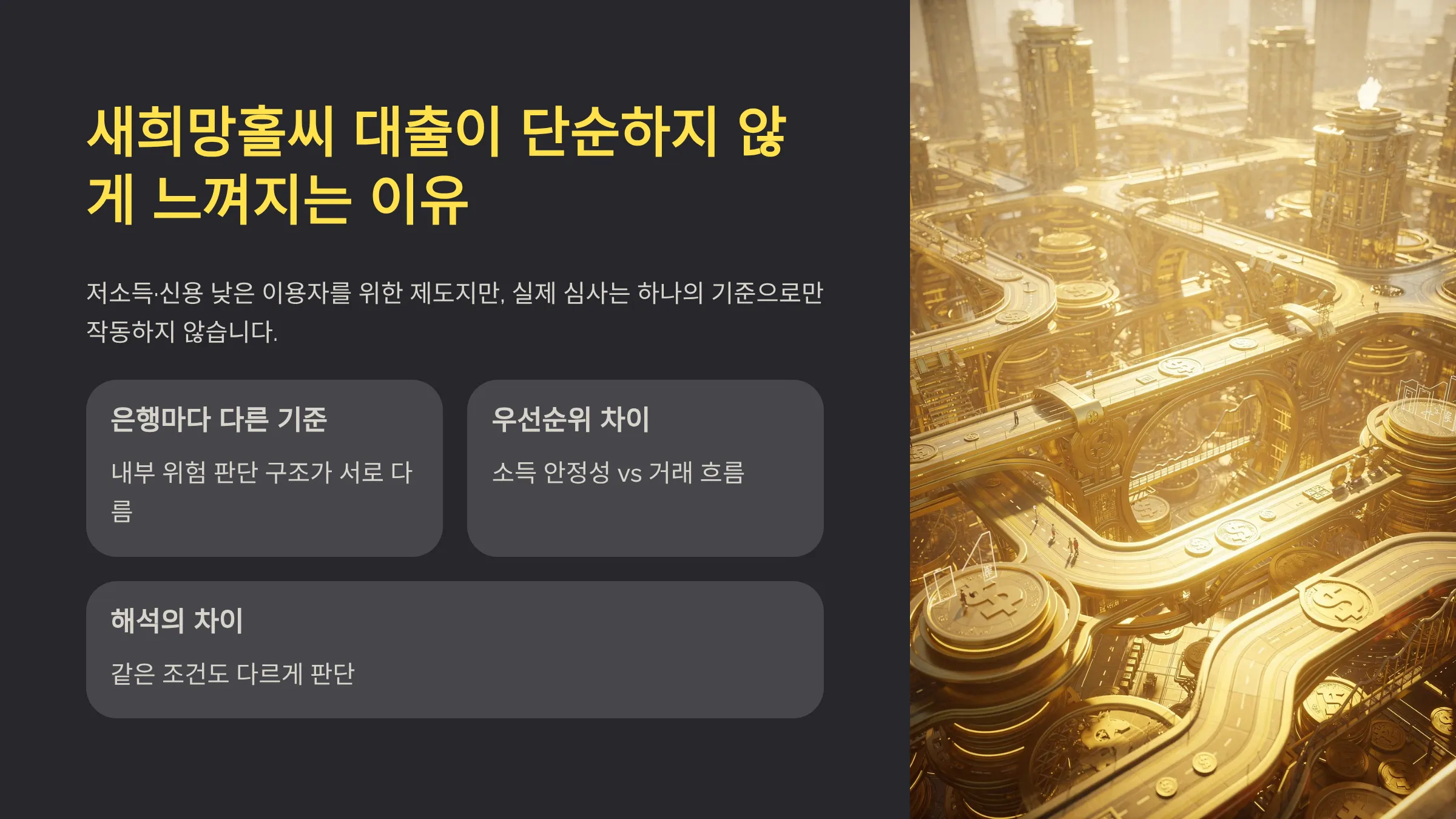 새희망홀씨는 저소득 또는 신용 상태가 낮은 금융 이용자를 위해 마련된 제도이지만, 실제 심사 과정은 하나의 기준으로만 작동하지 않습니다. 은행마다 내부 위험 판단 구조가 다르고, 같은 소득과 같은 신용 상태라도 어떤 항목을 먼저 확인하느냐에 따라 해석이 달라질 수 있습니다.