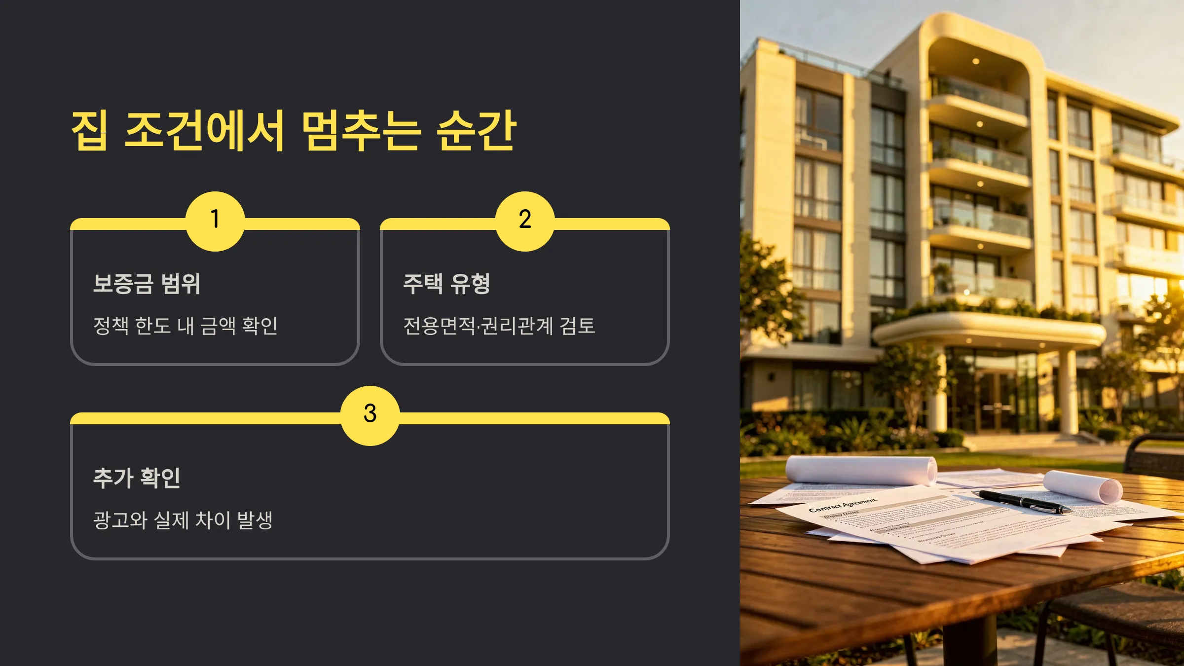 사람 조건이 맞아도 집 조건에서 멈추는 사례는 반복됩니다. 보증금 범위, 주택 유형, 전용면적 같은 항목이 함께 작동하고, 권리관계 확인이 필요하면 절차가 길어질 수 있습니다. 광고에 “대출 가능”이 적혀 있어도, 실제로는 추가 확인이 붙는 집이 있습니다. 이때 일정이 촉박하면 체감은 ‘탈락’으로 바뀌기 쉽습니다.