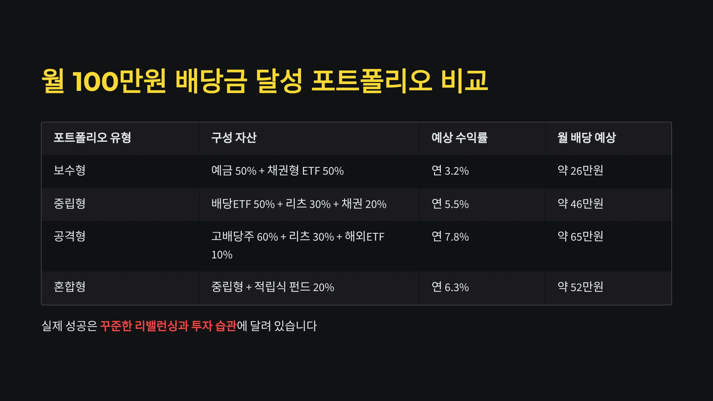 각 구성은 리스크 성향에 따라 달라지며, 실제 외벌이집 월100만원 배당금 비결은 꾸준한 리밸런싱과 투자 습관에 달려 있습니다.